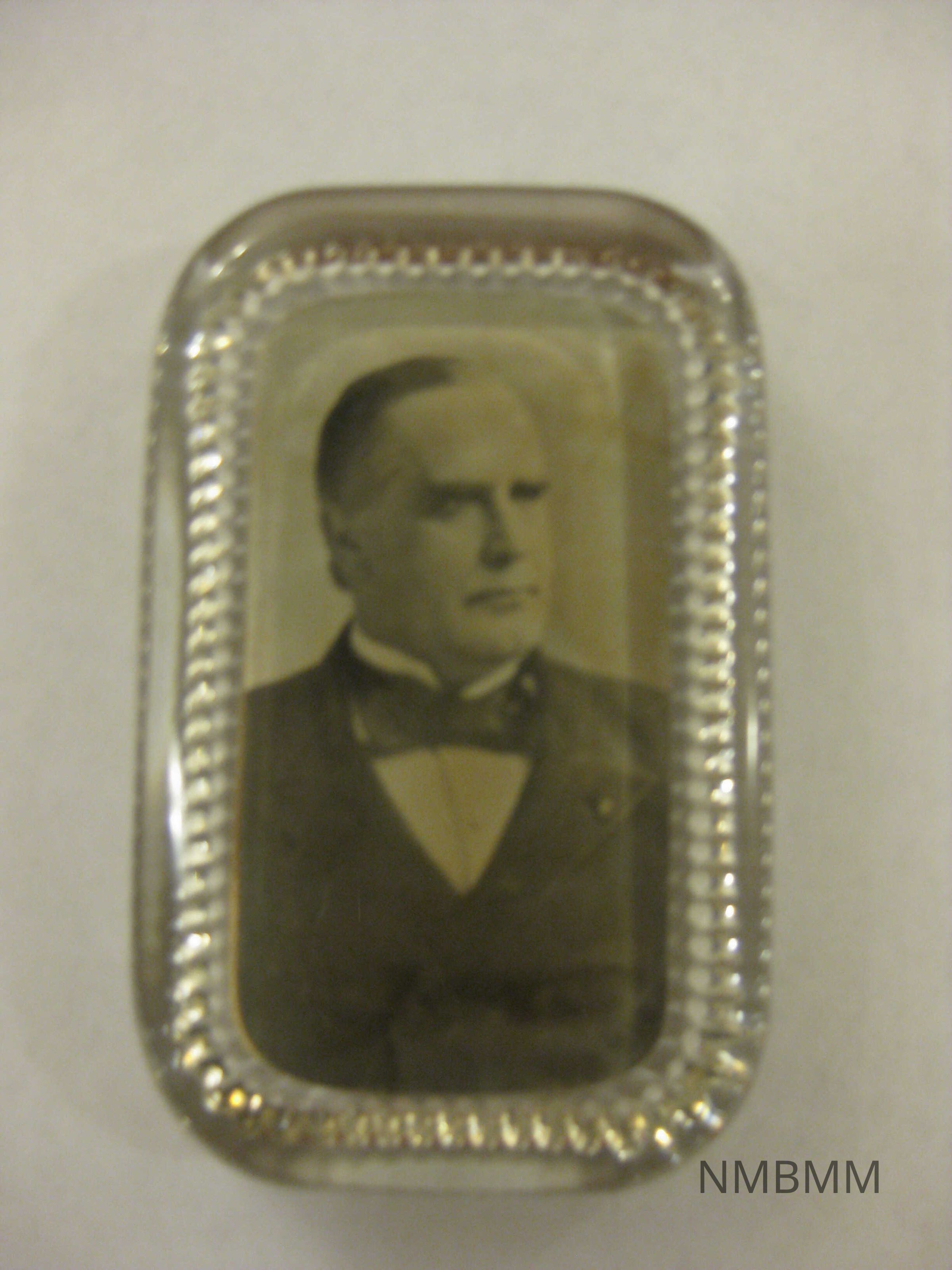 The item is a glass paperweight featuring a square portrait with rounded edges of President McKinley. The backside of the paperweight is a leather seal placed over the exposed back of the picture. It was produced by the Empire Art Co., New York.Collection