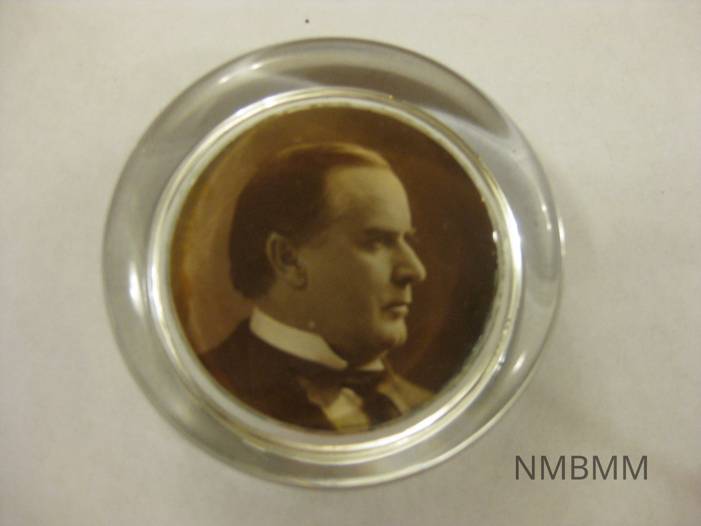 The item is a round glass paperweight featuring a circle portrait of President McKinley. The backside of the paperweight is a black leather seal placed over the exposed back of the picture. The seal is scratched pretty heavily.