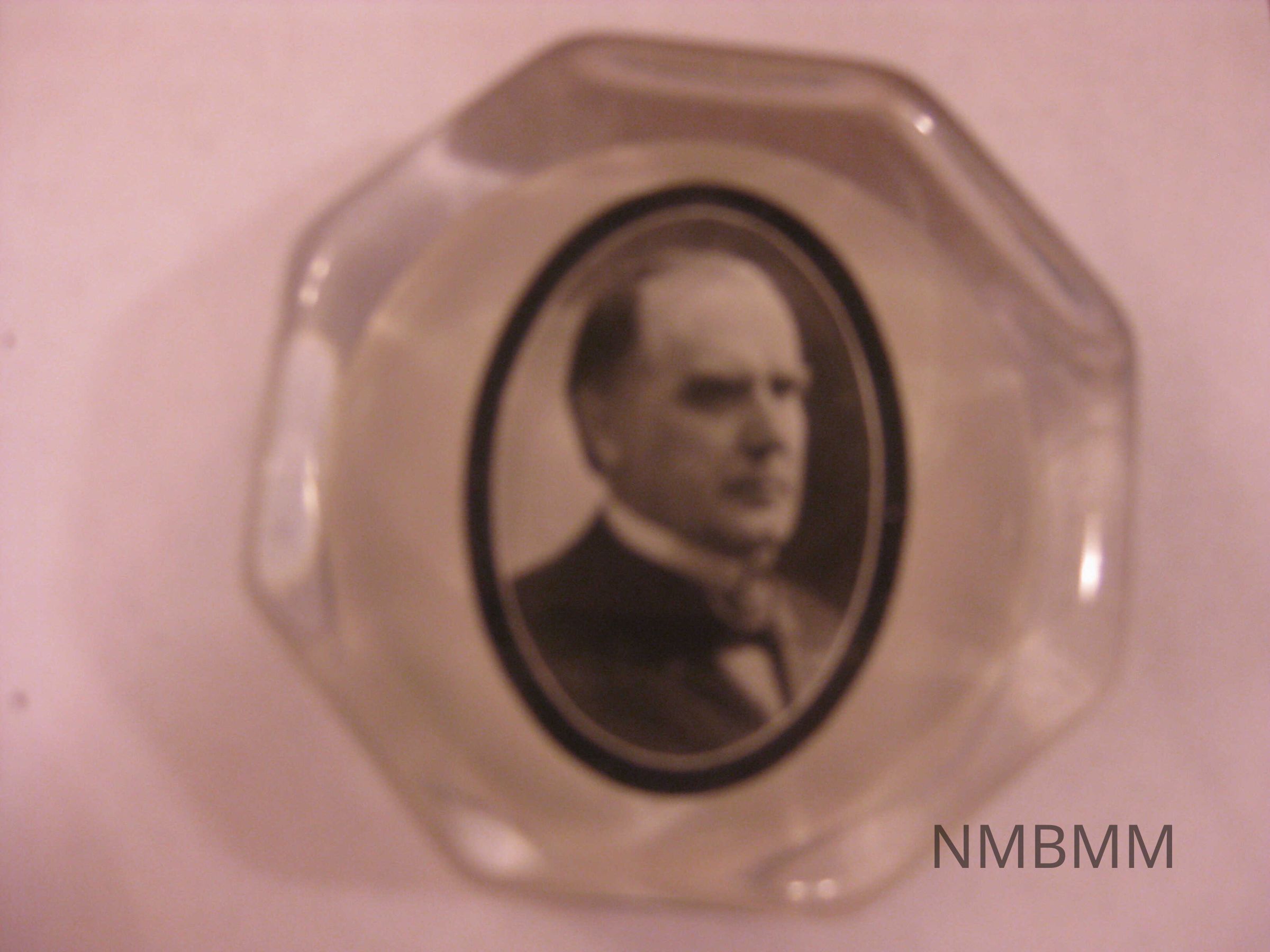 The item is a octagon shaped glass paperweight featuring an oval black and white portrait of President McKinley inside. The backside of the paperweight is sealed and in good condition.