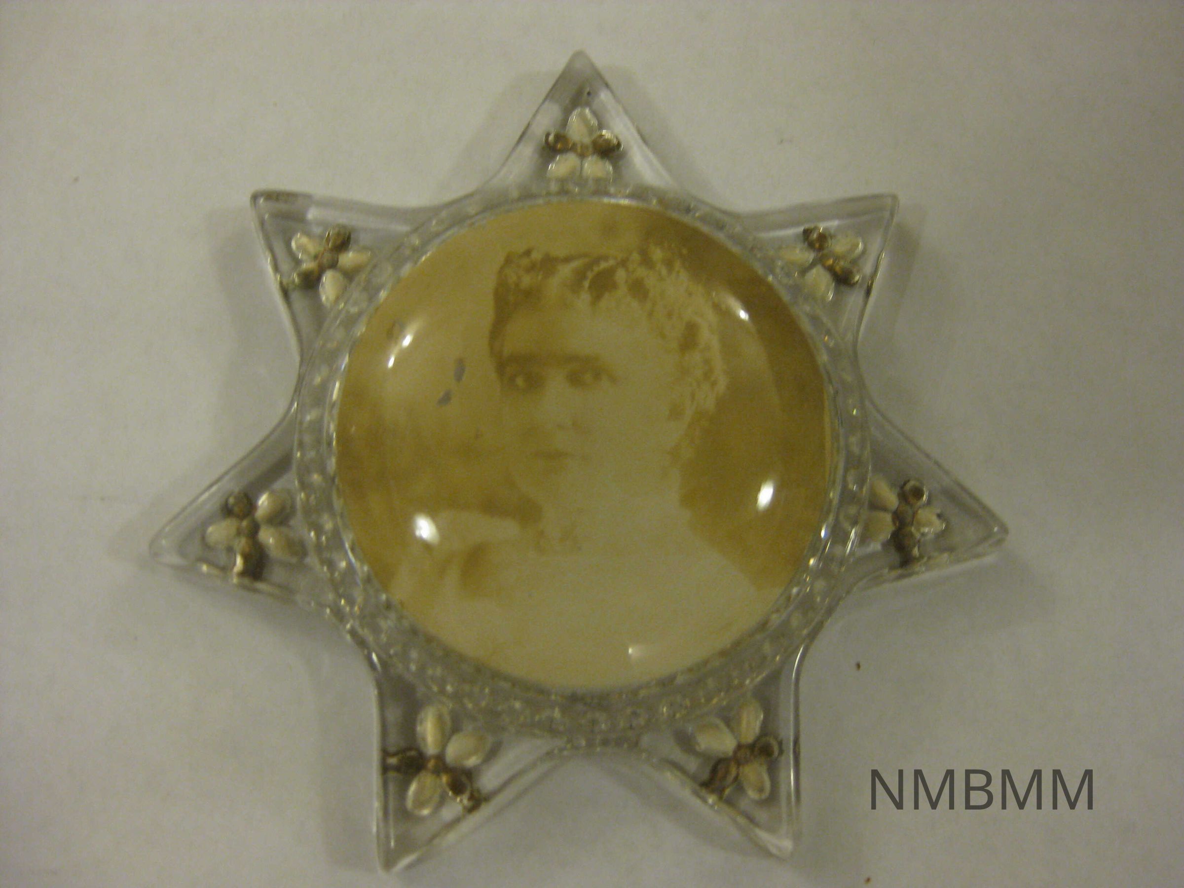 The item is a star shaped glass paperweight featuring a raised dome with a sepia toned portrait of Mrs. McKinley. The peaks of the star are painted with white and gold paint inside decorative flower grooves. The backside is missing a seal and the back of the picture is exposed.