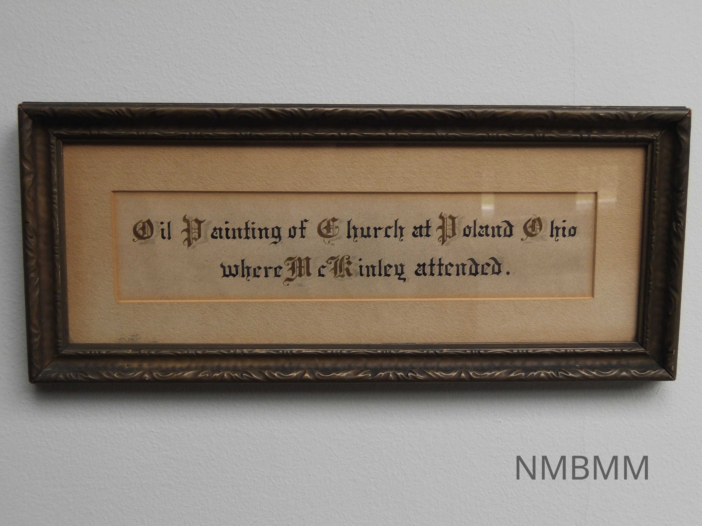 A) OIL PAINTING OF METHODIST EPISCOPAL CHURCH IN POLAND, OHIO MCKINLEY ATTENDED WHILE IN COLLEGE. METAL FRAME. 16" X 13" B) ADDITIONAL FRAMED EXPLANATORY LABEL INCLUDED. 17 x 7 1/4 inches. name of artist appears to be C.S. Barclay