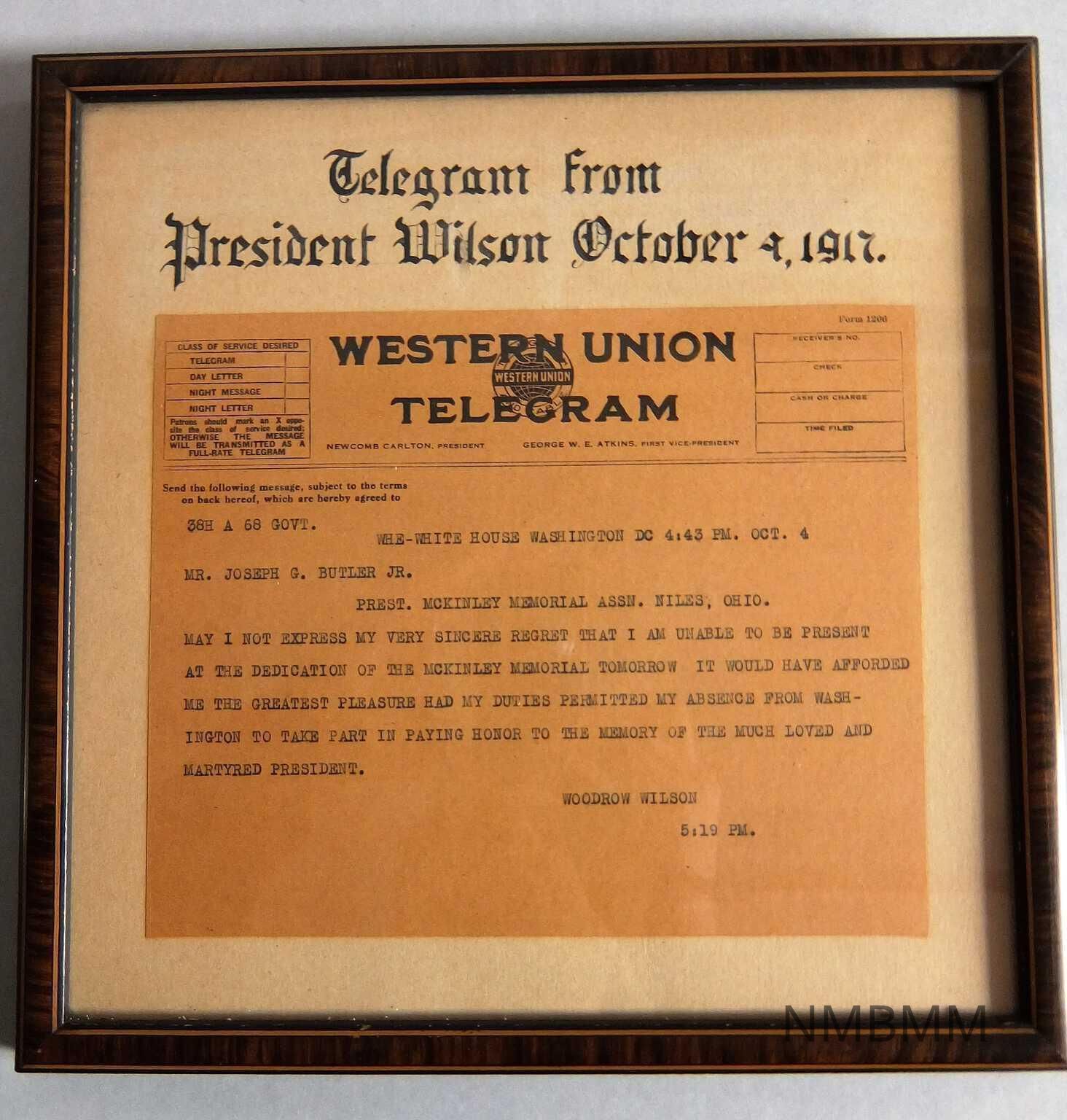 Telegram from President Woodrow Wilson sending his regrets at not being able to attend the dedication. October 4, 1917.Acquisition