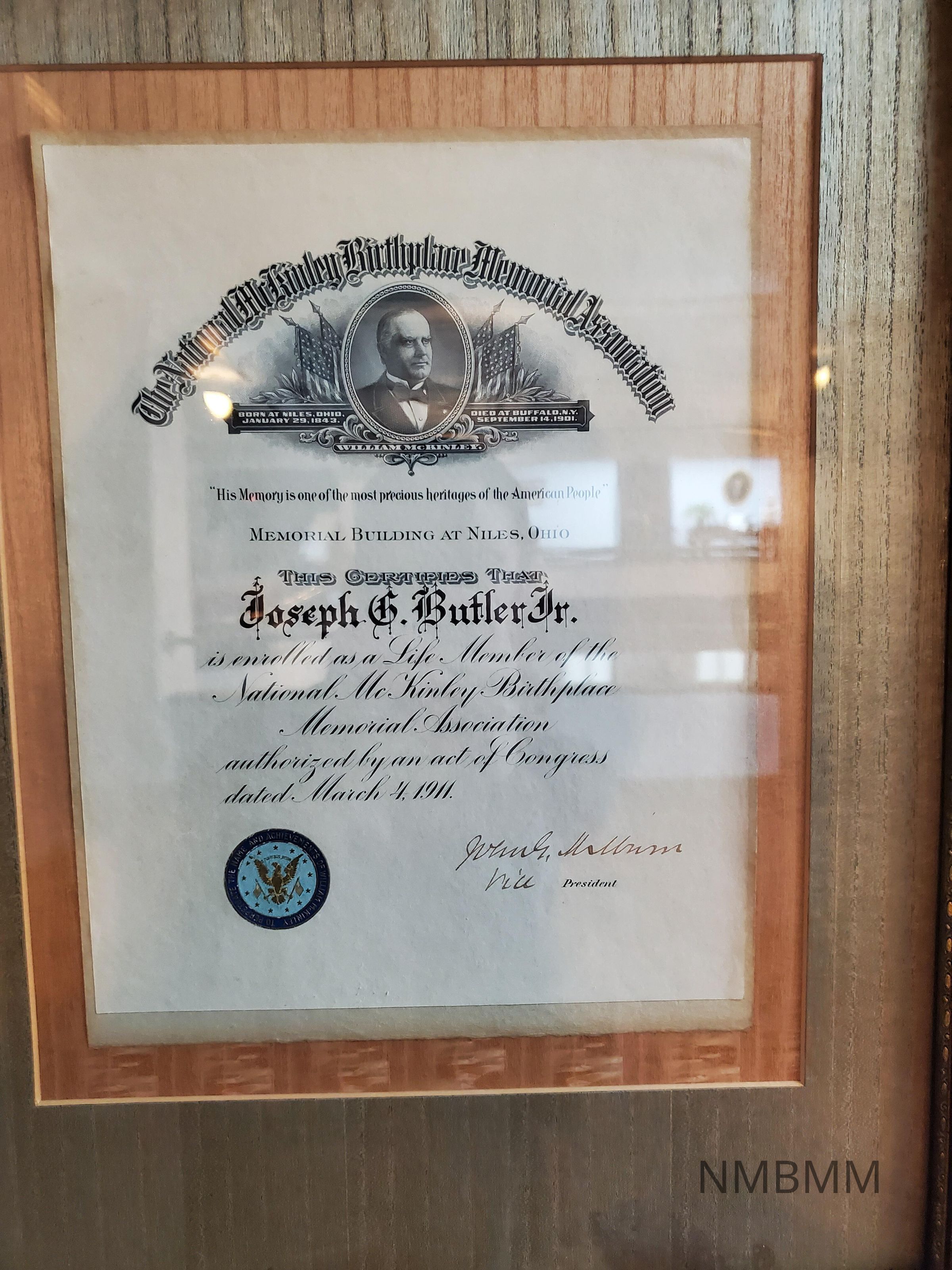 Certificate of Lifetime Membership in memorial association of J.G. Butler