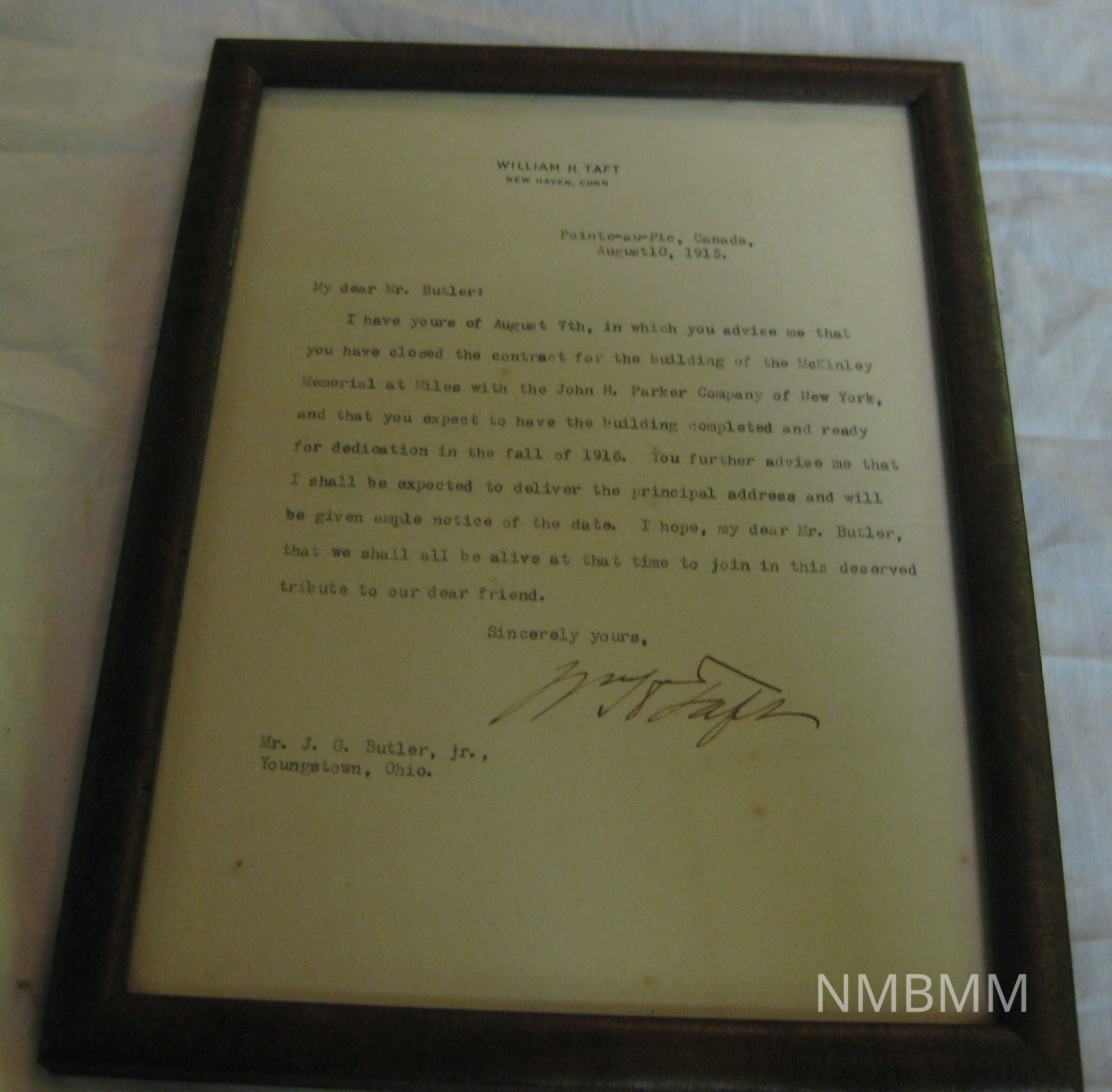 LETTER FROM WILLIAM HOWARD TAFT TO J.G. BUTLER ACCEPTING INVITATION TO SPEAK AT DEDICATION. WOOD FRAME. 8" X 10"