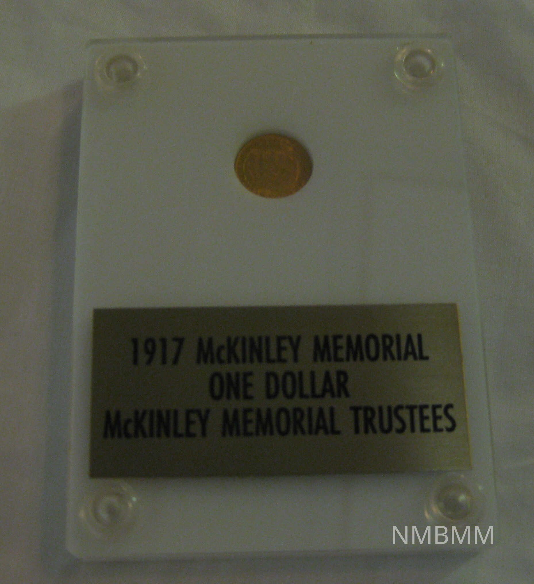 REPLICA GOLD DOLLAR MINTED TO COMMEMORATE ERECTION OF MEMORIAL. SHOWS HEAD AND OHIO SEAL. 1.5" IN DIAMETER. 9,977 MINTED. IN 1917 10,000 MINTED.