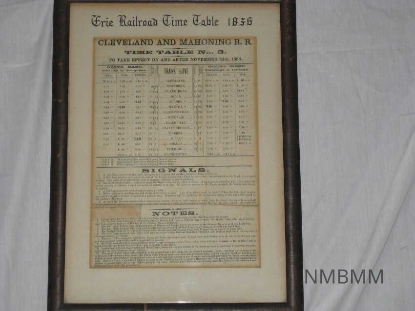 RAILROAD TIMETABLE OF THE CLEVELAND AND MAHONING RAILROAD, 1856. WOOD FRAME. 11" X 15"Collection