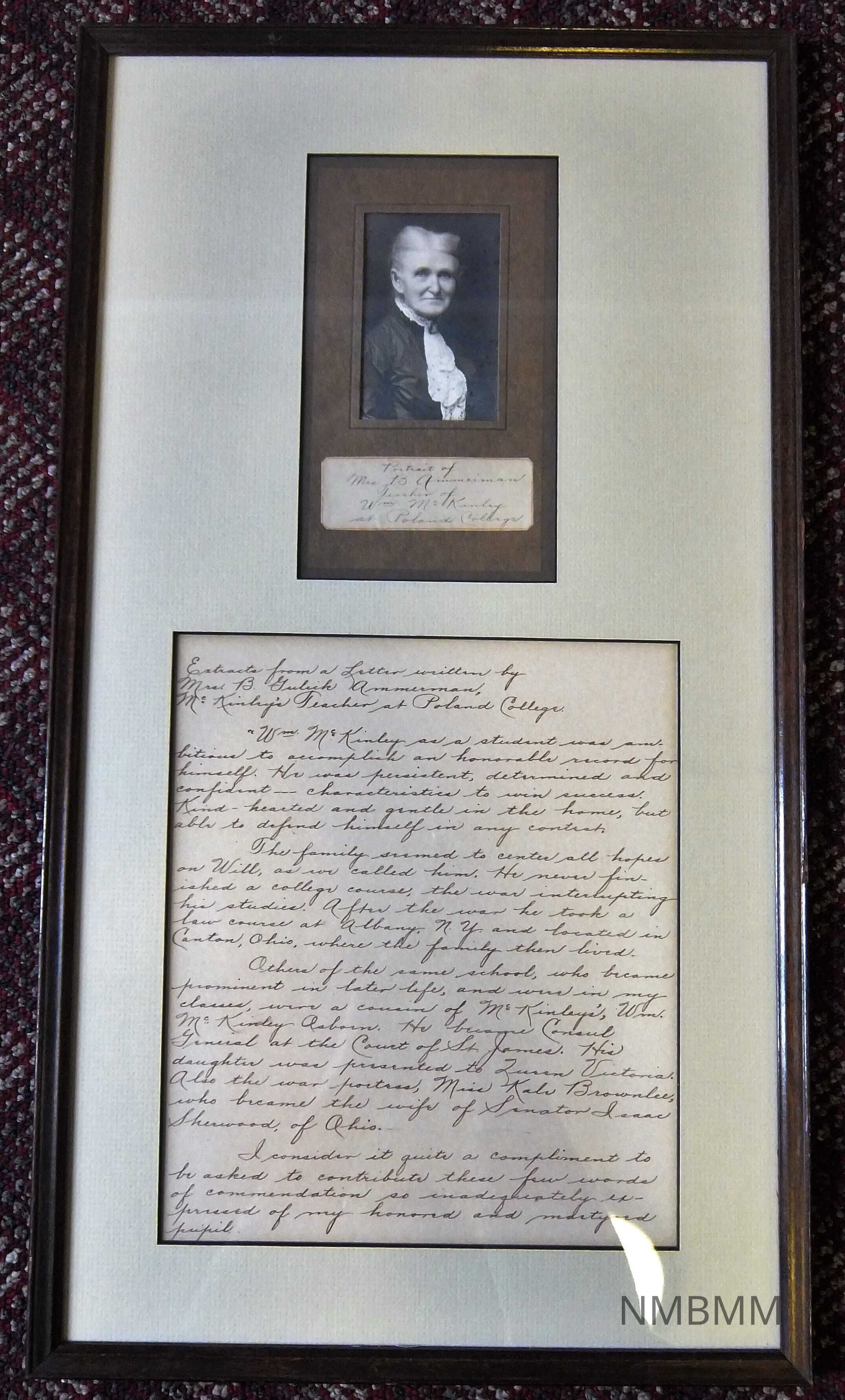 PHOTOGRAPH OF MRS. B.G. AMMERMAN, MCKINLEY'S TEACHER AT POLAND ACADEMY. WOOD FRAME. 12" X 22" FRAMED BY LIBRARY. ALSO IN FRAME IS A LETTER FROM MRS. B.G. AMMERMAN.Collection
