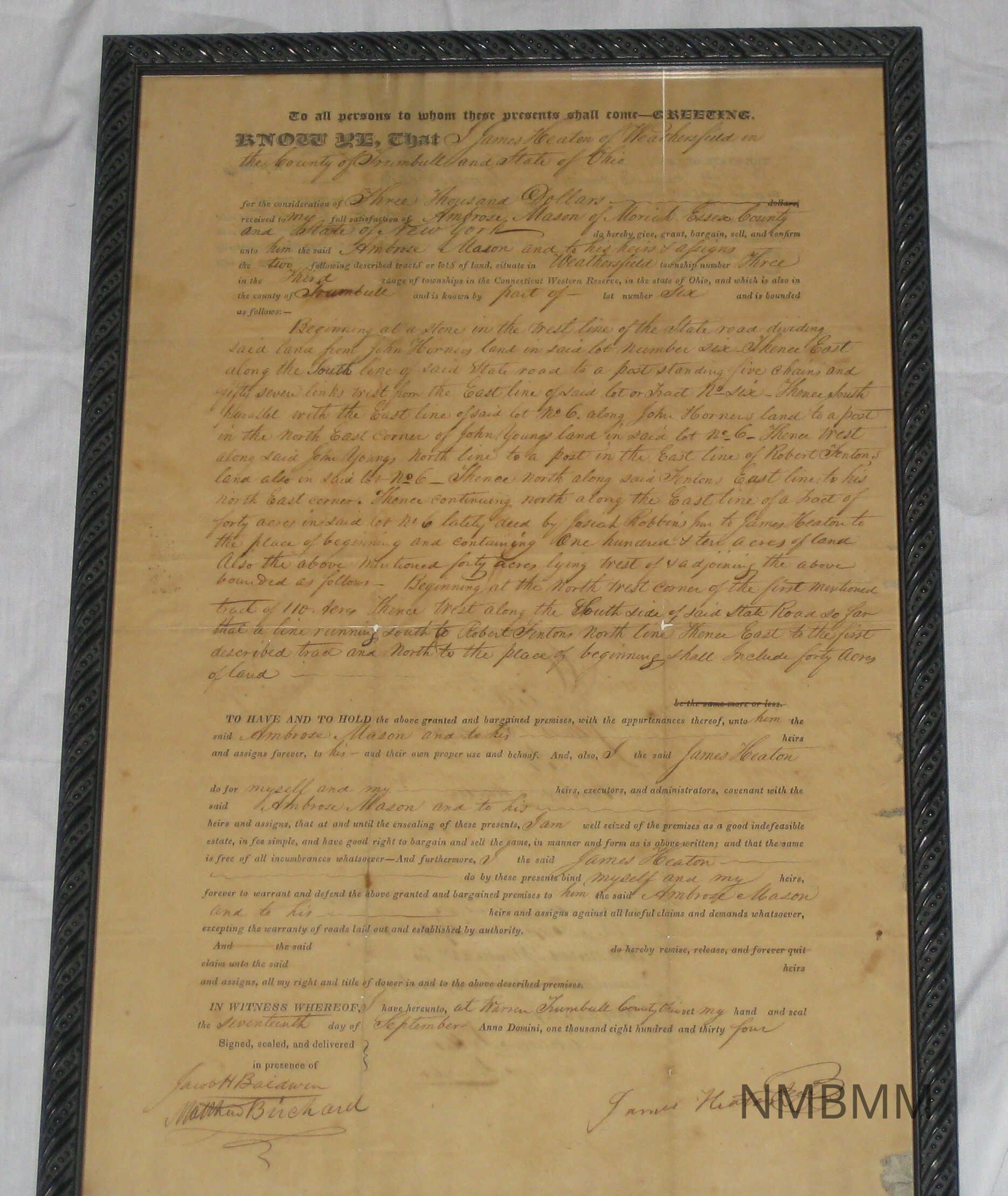 DEED OF JAMES HEATON TO AMBROSE MASON. METAL FRAME 11" X 16" SEPTEMBER 17, 1834. SITE OF NILES.Collection