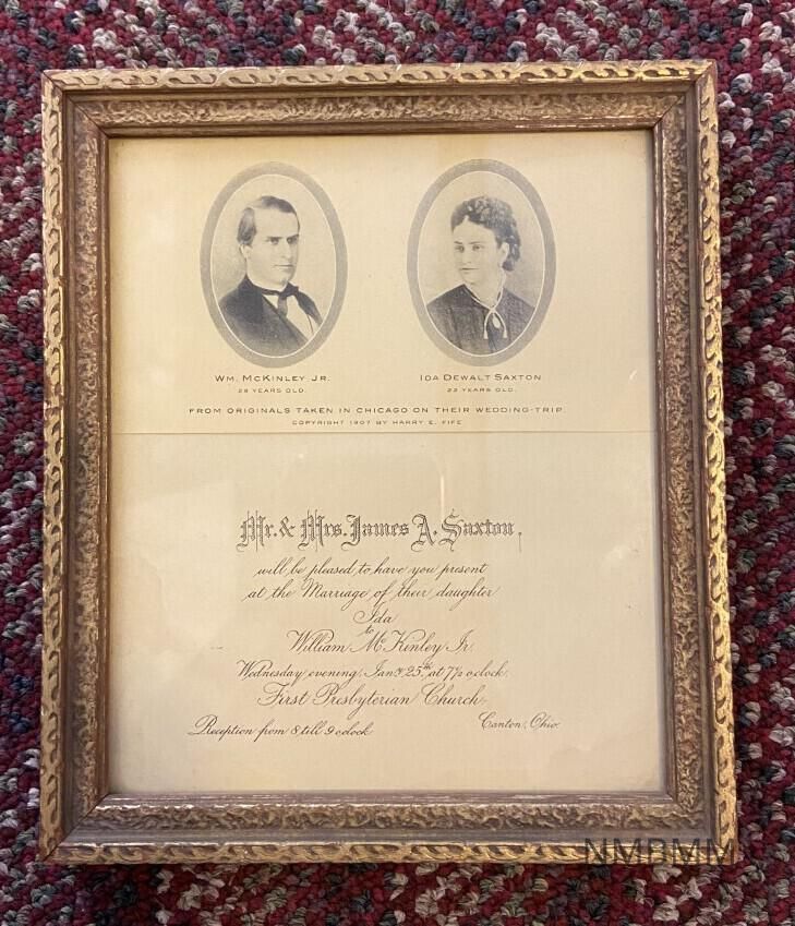 The invitation reads 'Mr. & Mrs. James A. Saxton will be pleased to have you present at the marriage of their daughter Ida to William McKinley, jr. Wednesday evening, Jan. 25th at 7 1/2 o'clock, First Presbyterian Church, reception from 8 til 9 o'clock, Canton, Ohio'"