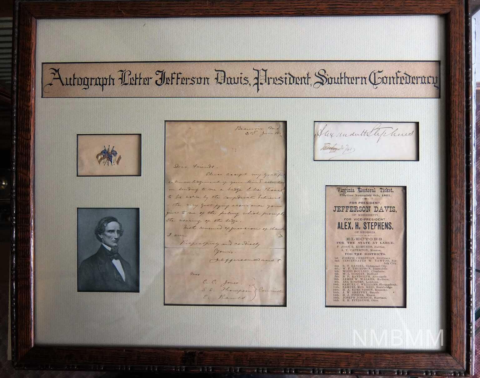 Letter to Jones, Thompson, Rawls from Jefferson Davis, June 18, 186_, Thanking them for badges. Transcription: Beauvoir, Miss. 2nd June 18___ Dear Friends, Please accept my grateful acknowledgement of your kind attention in sending to me a badge like those to be worn by confederate veterans___ the very gratfying assurance you give to me of the feeling which prompt the wearing of the badge. With renewed expression of thanks I am Respectively and cordially Yours, Jefferson Davis Mrs. C.C. Jones S.S. Thompson Committee C. Rawls May have been written 1886, 1887 both years when Davis was invited to join Confederate reunions in Augusta, Georgia, the invitations issued by Mrs. Charles C. Jones, Jr. (1841-90). Davis was writing from Beauvior, his retirement home near Biloxi, Mississippi, where he lived from 1877 until his death in December 1889. Also located in the frame is the autographed signature of Alexander H. Stephens, dated October 20, 1861. Below this signature is the "Virginia Electoral Ticket. Election November 6th, 1861." This election was for the Confederate States of America. The candidate for President was Jefferson Davis and for Vice-President was Alex H. Stephens. Both were elected.