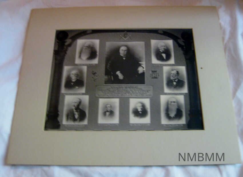 PHOTOGRAPH OF MCKINLEY AND OFFICERS OF HIRAM MASONIC LODGE, WINCHESTER, VIRGINIA AFTER MCKINLEY ADMITTED. UNFRAMED GRAY MAT. 14" X 17"