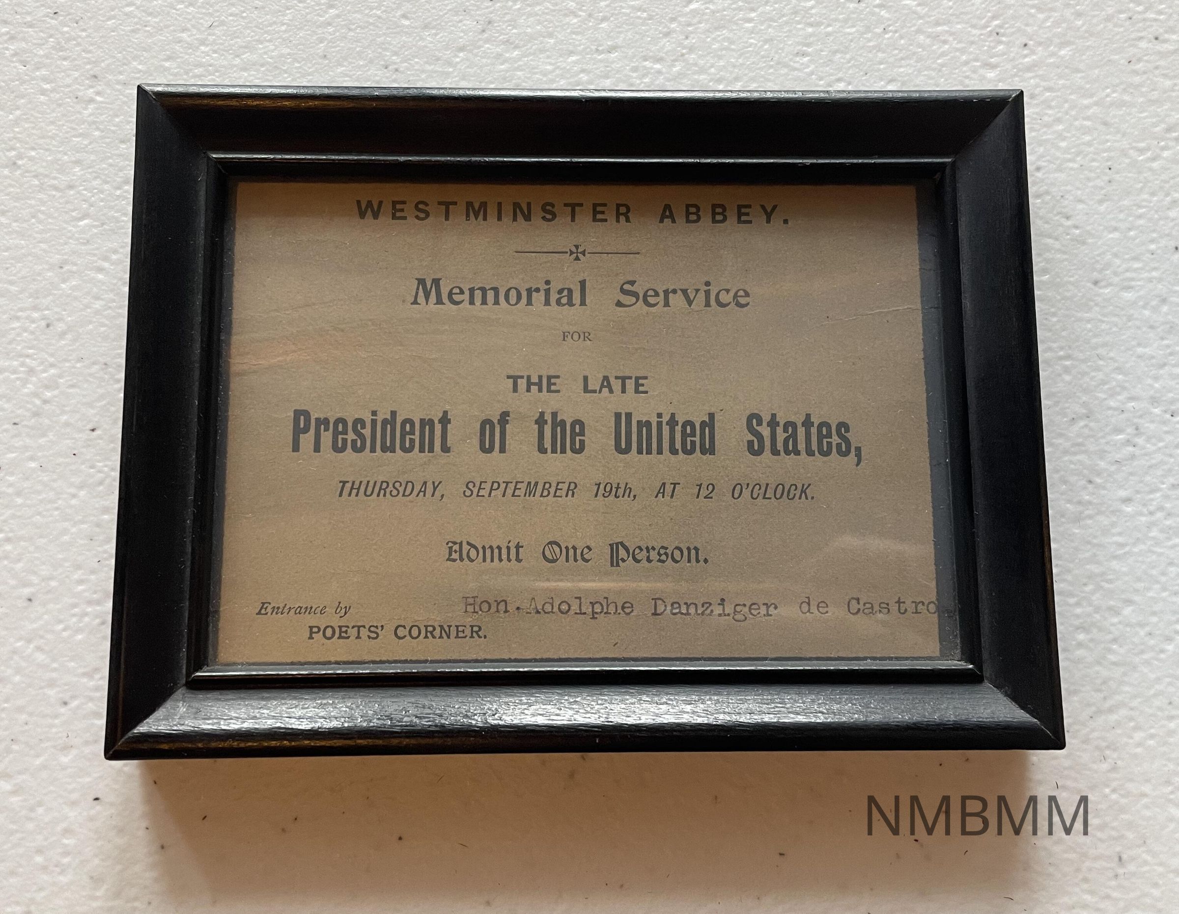 Ticket to memorial service in Westminster Abbey, September 19, 1901. Issued to Adolphe Danzinger De Castro.