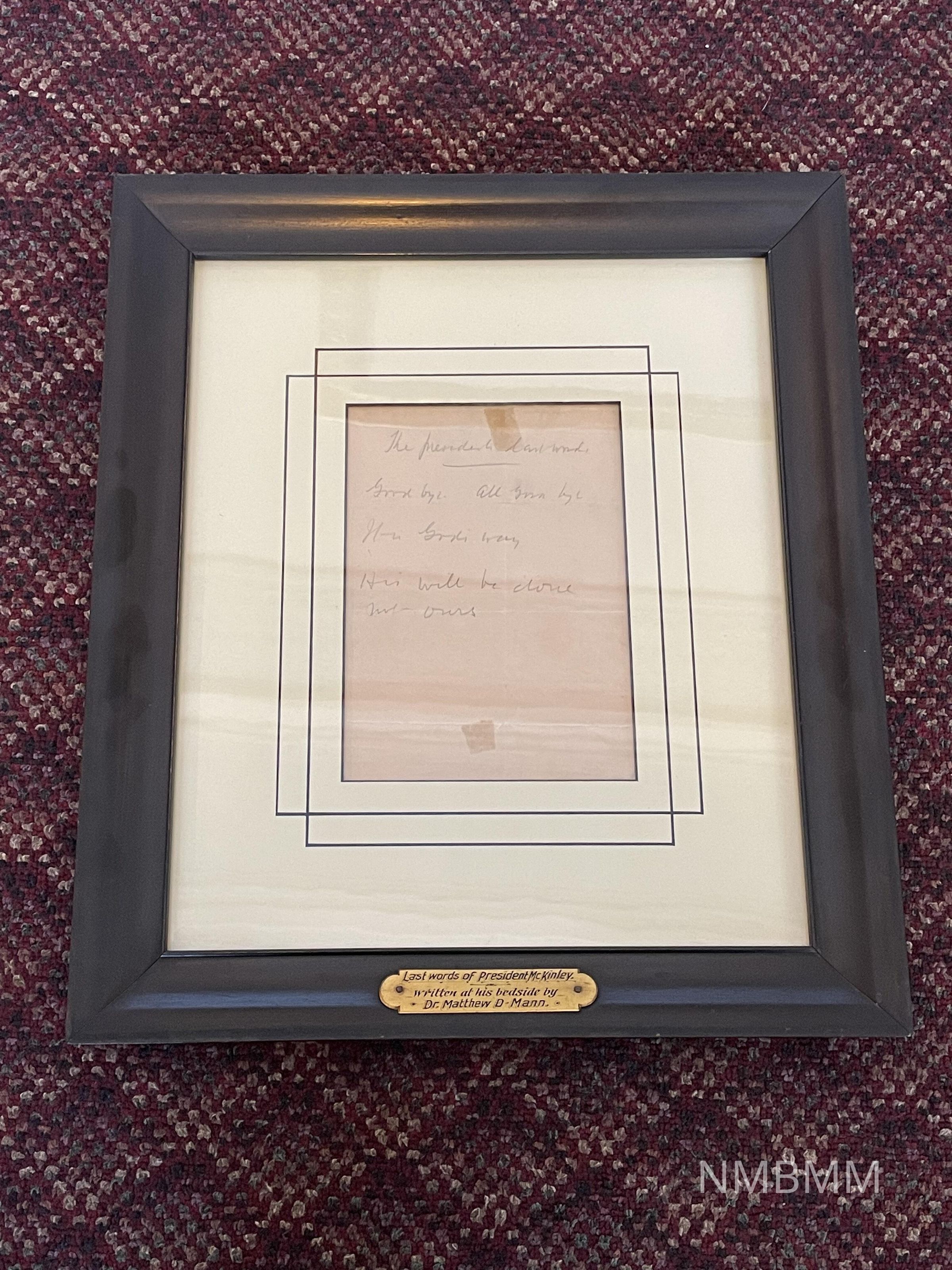 A handwritten note reportedly written by Dr. Mann stating McKinley's last words.