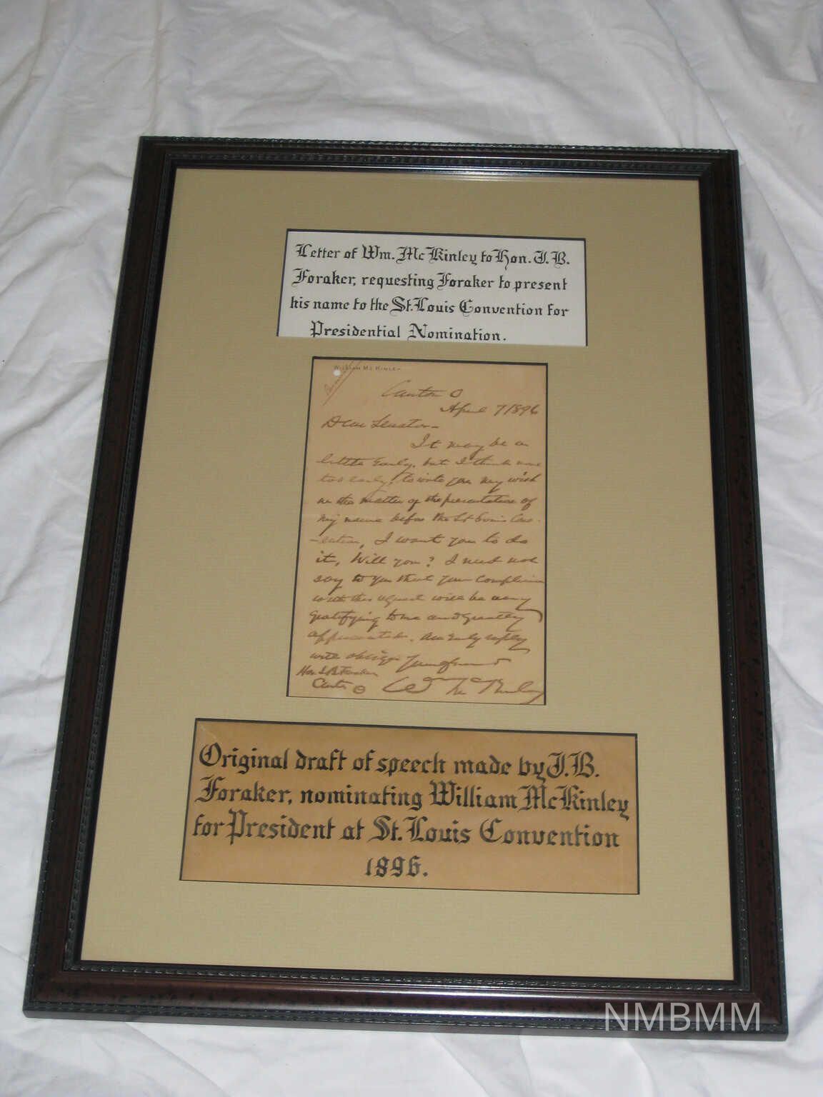 Letter from William McKinley to J.B. Foraker requesting his name be put in for the Republican Convention, April 7, 1896.Acquisition
