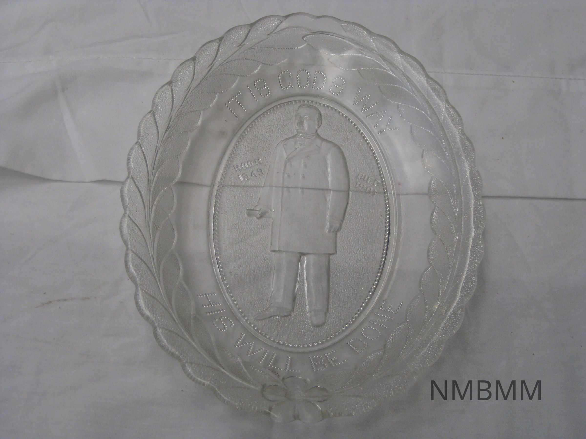 GLASS PLATE WITH SCULPTED EDGES AND OUTLINE OF MCKINLEY. "IT IS GOD'S WAY HIS WILL BE DONE" 8" X 11"