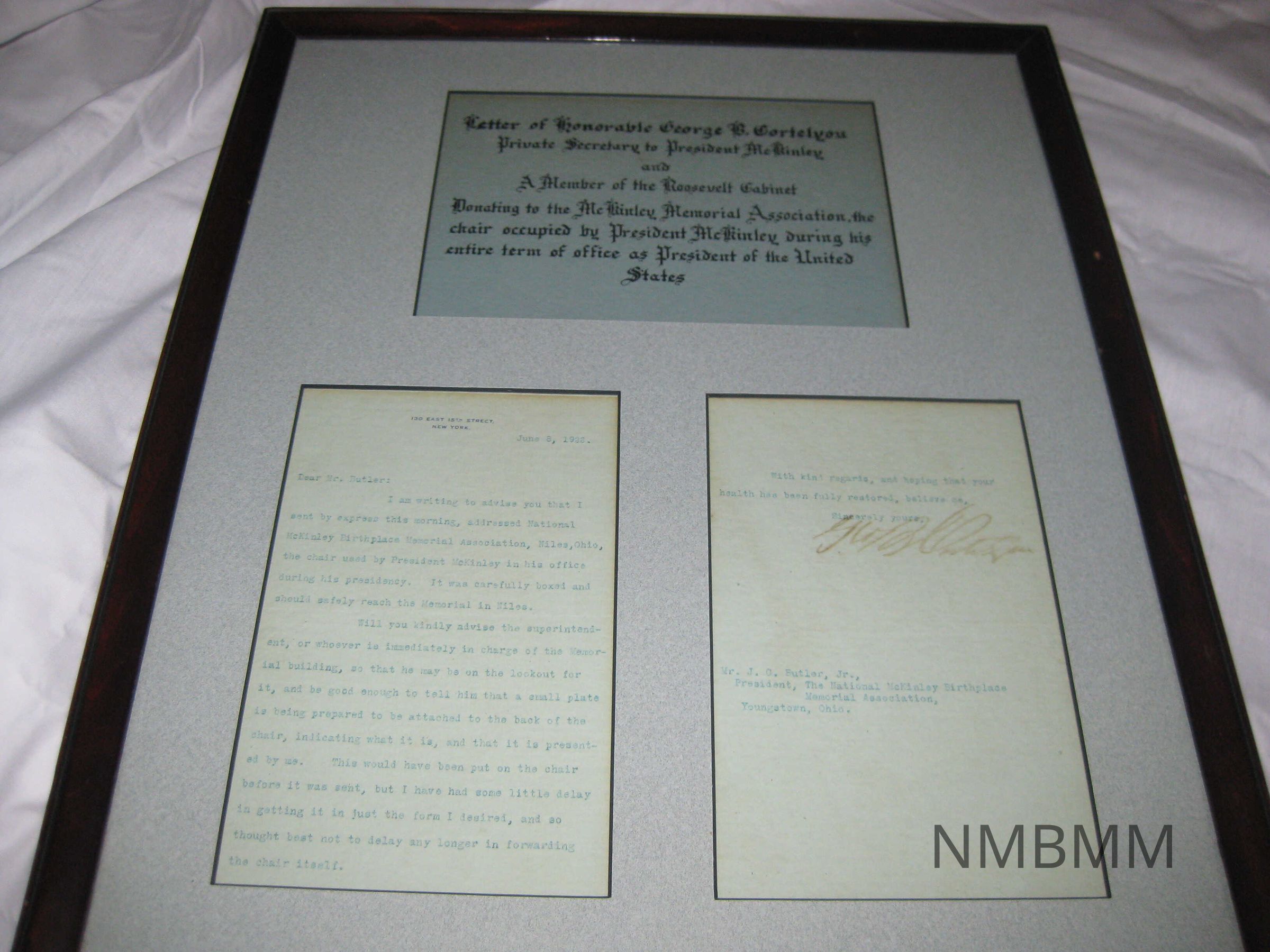 LETTER FROM GEORGE CORTELYOU DONATING THE CHAIR USED BY MCKINLEY. TO J.G. BUTLER. WOOD FRAME. 15" X 19"Collection