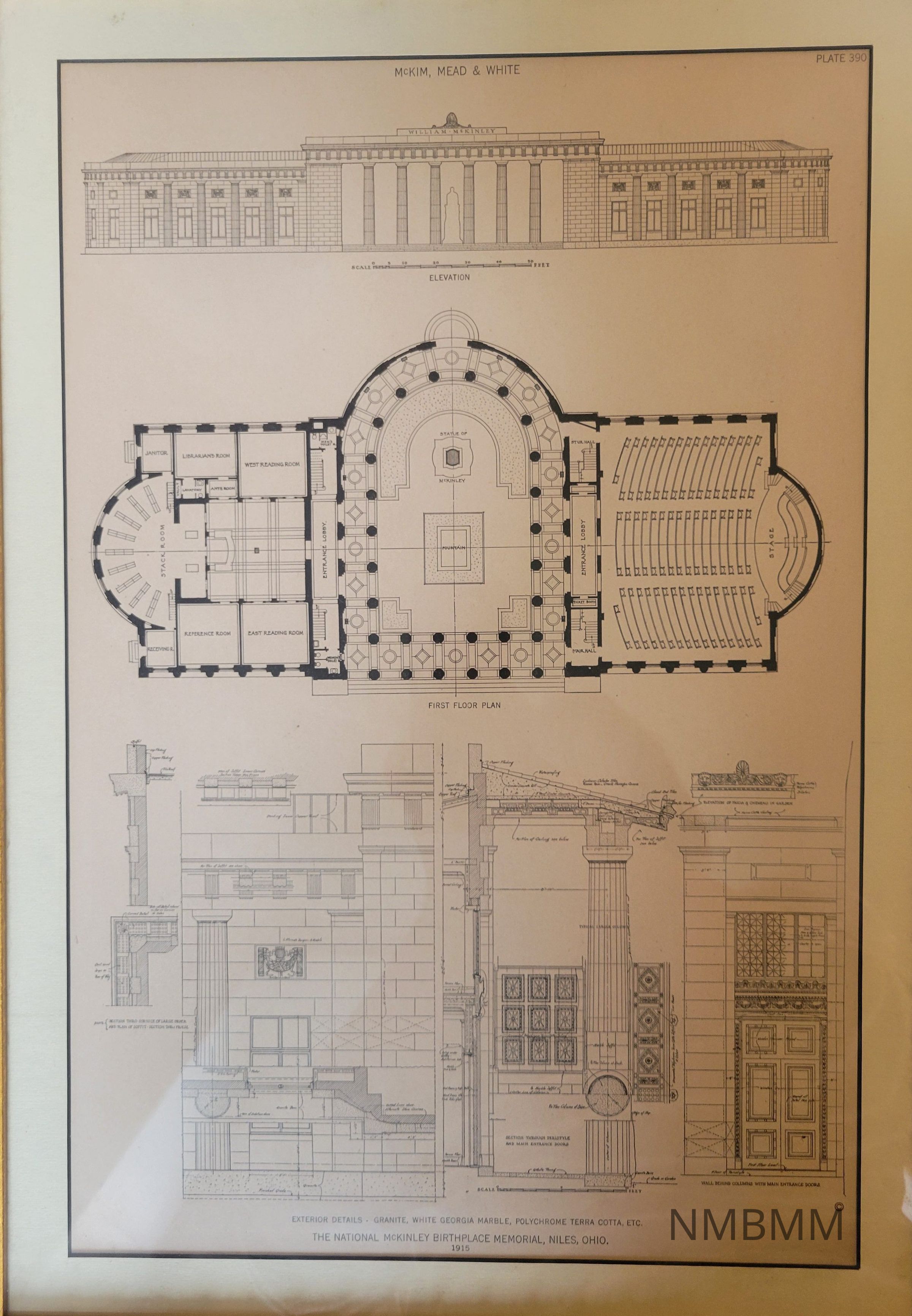 Print of the original floor plans of the McKinley Birthplace Memorial. The top image is a rendering of what the building looks like if one were standing outside. It shows the elevation. The second image is a bird's eye view of the first-floor plan depicting how the memorial was originally intended to be an auditorium. The third image is a close-up of the exterior details, namely the details and materials of the roof and columns.