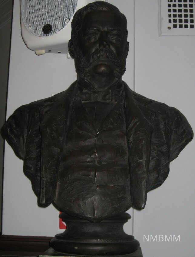 BRONZE BUST OF GEORGE WESTINGHOUSE, 37" HIGH. MARBLE PEDESTAL, 60" HIGH WITH BIOGRAPHICAL INFORMATION ON PEDESTAL " BORN OCTOBER 6TH 1846; DIED MARCH 12TH 1914"