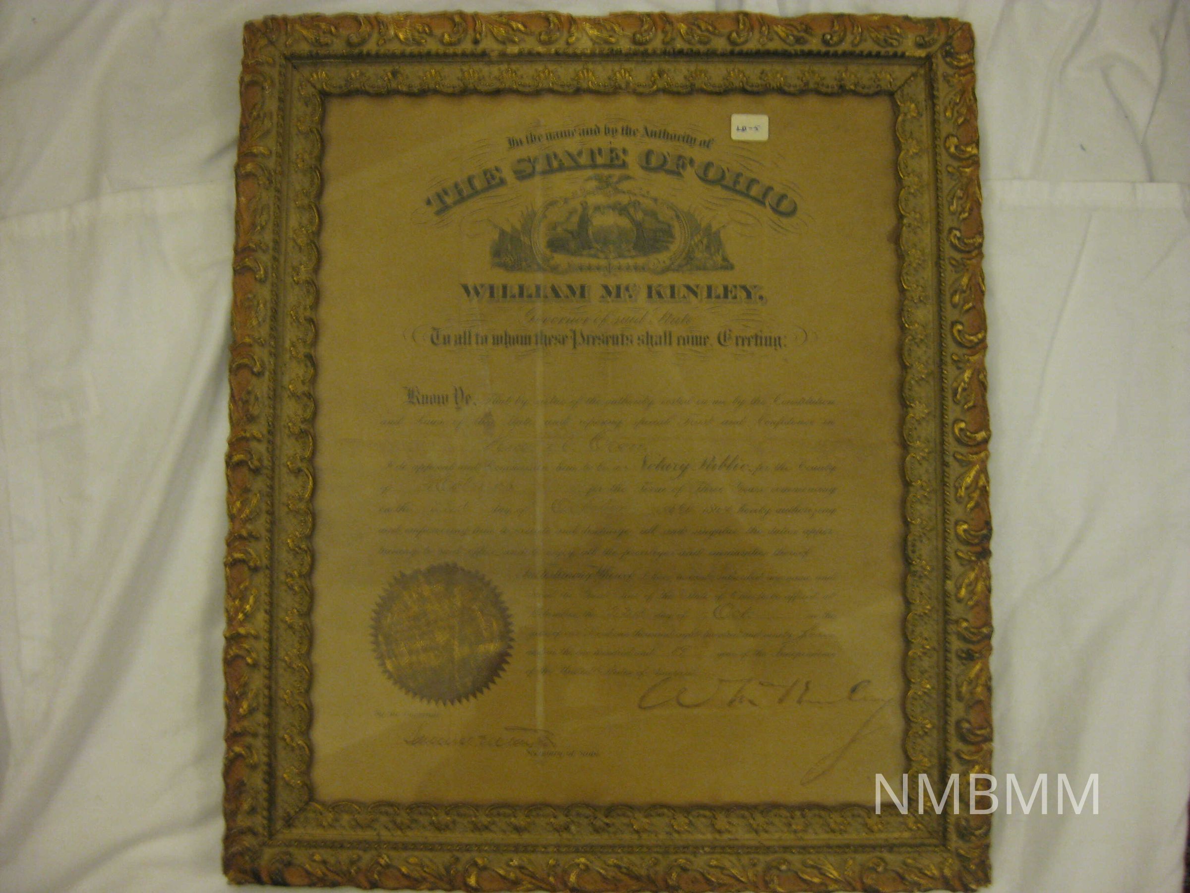 An 1894 document signed by McKinley as Governor of Ohio, certifying that William N. Crow is a Notary Public in Holmes County, Ohio.Collection