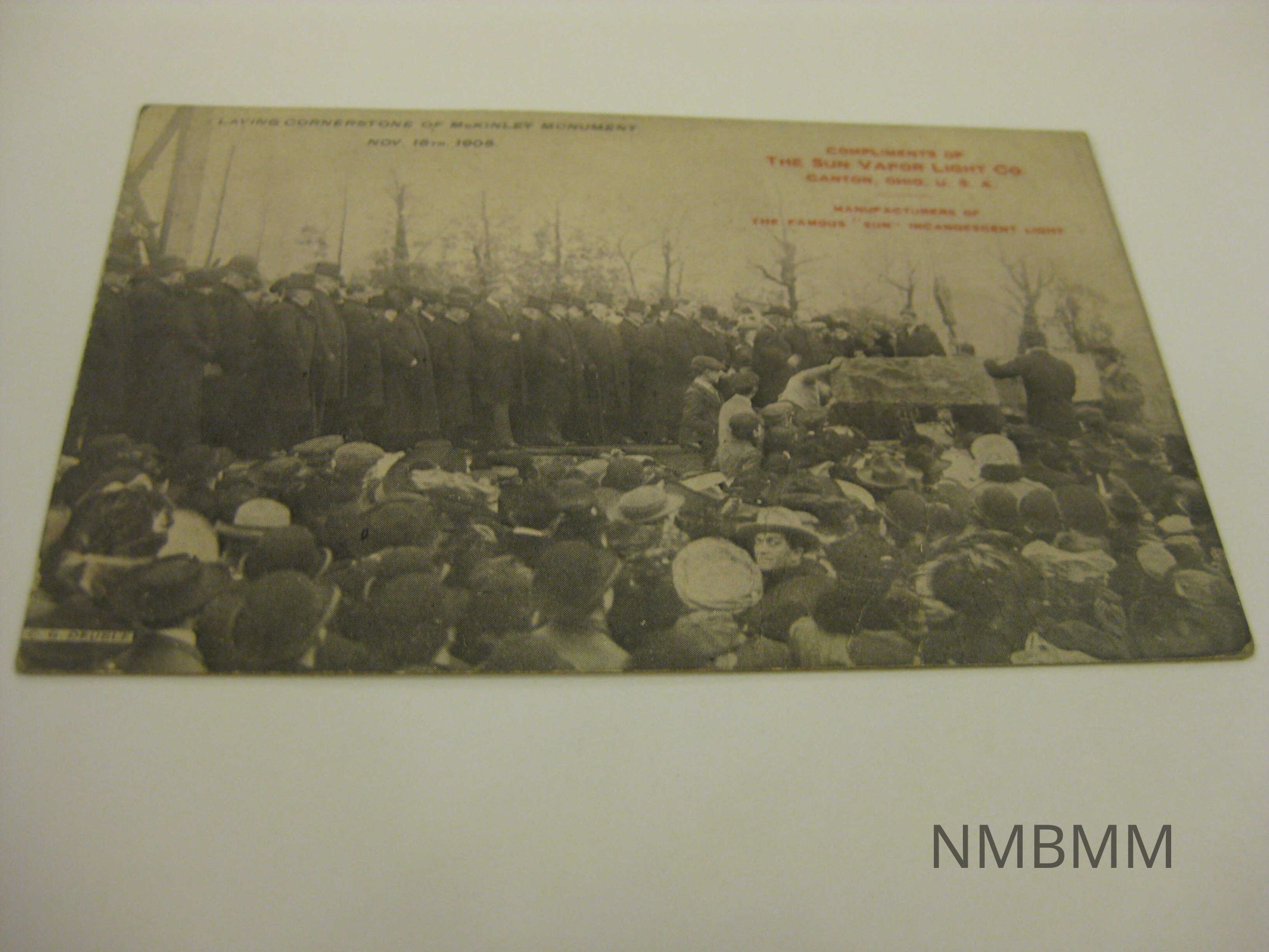 This item is a black and white postcard with an image of the laying of the cornerstone of the McKinley Monument. There is a crowd of people watching. Compliments of the Sun Vapor Light Co. Canton, Ohio, U.S.A. Manufacturers of the Famous "Sun" Incandescent Light. By C.G. Deuble, Canton, O. Back side: Required One cent stampCollection