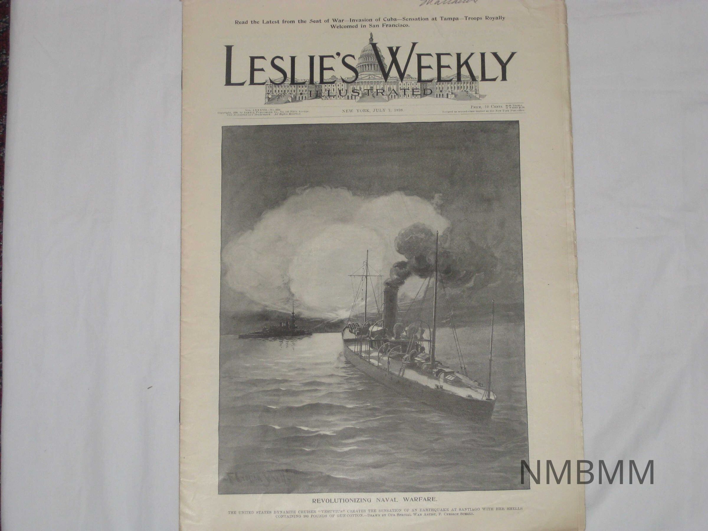 An issue of Leslie's Weekly Illustrated, Vol. LXXXVII No. 2234, it was copyrighted by the Arkell Publishing Company in New York on July 7, 1898. The front cover features a drawing of the U.S. Cruiser "Vesuvius," with the title "Revolutionizing Naval Warfare."and the caption "The United States Dynamite Cruiser "Vesuvius" Creates The Sensation Of An Earthquake At Santiago With Her Shells Containing 200 Pounds of Gun-Cotton.-Drawn By Our Special War Artist, F. Cresson Schell.Collection