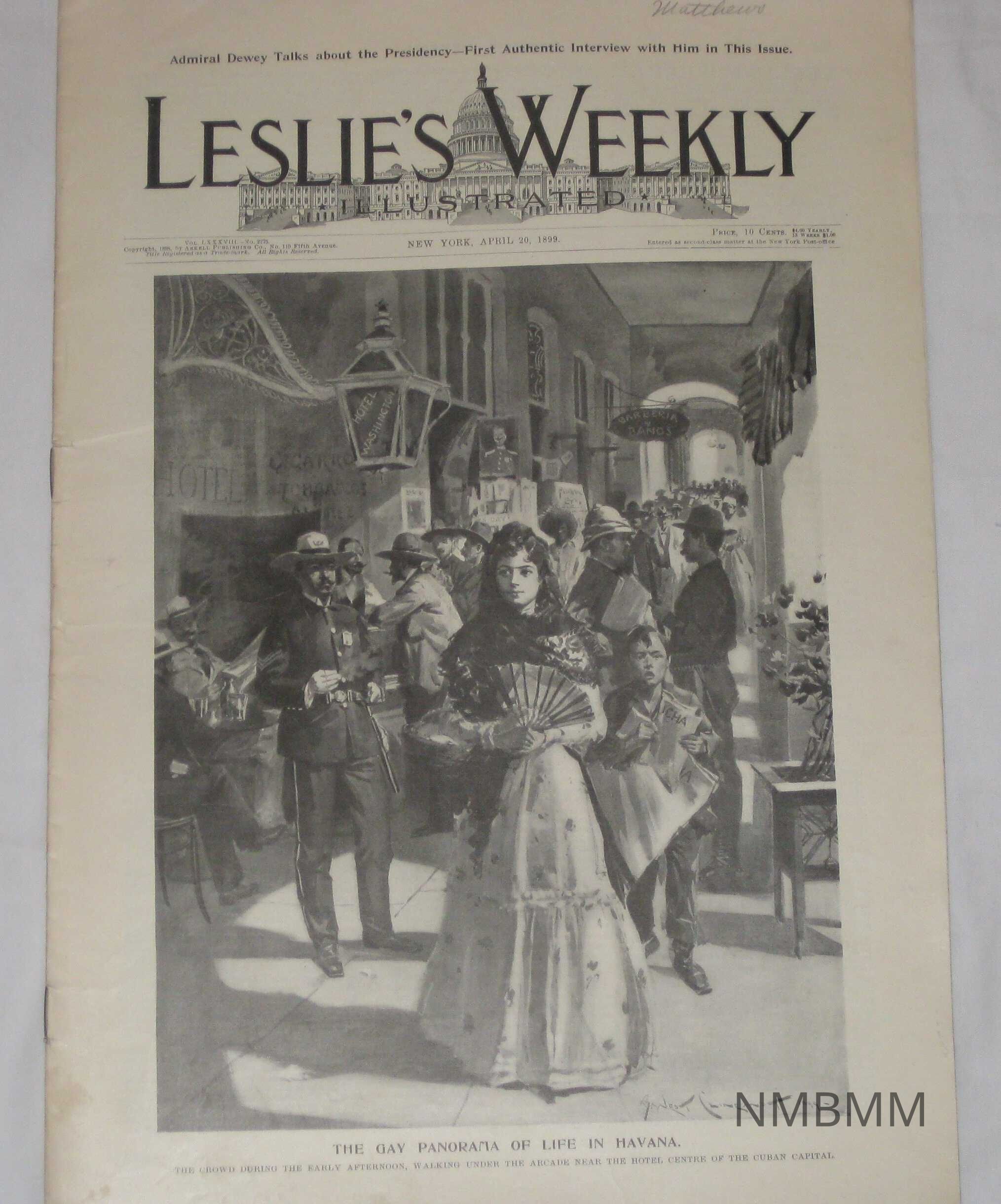 An issue of Leslie's Weekly Illustrated, Vol. LXXXVIII No. 2275. It was copyrighted by the Judge Company on 110 Fifth Avenue and published in New York on April 20, 1899. Printed at the top of the issue is "Admiral Dewey Talks about the Presidency- First Authentic Interview with him in This Issue." The front cover is an illustration of a crowd in Havana, with the caption "The Gay Panorama of Life in Havana, The crowd during the early afternoon, walking under the arcade near the hotel, centre of the cuban capital."Collection