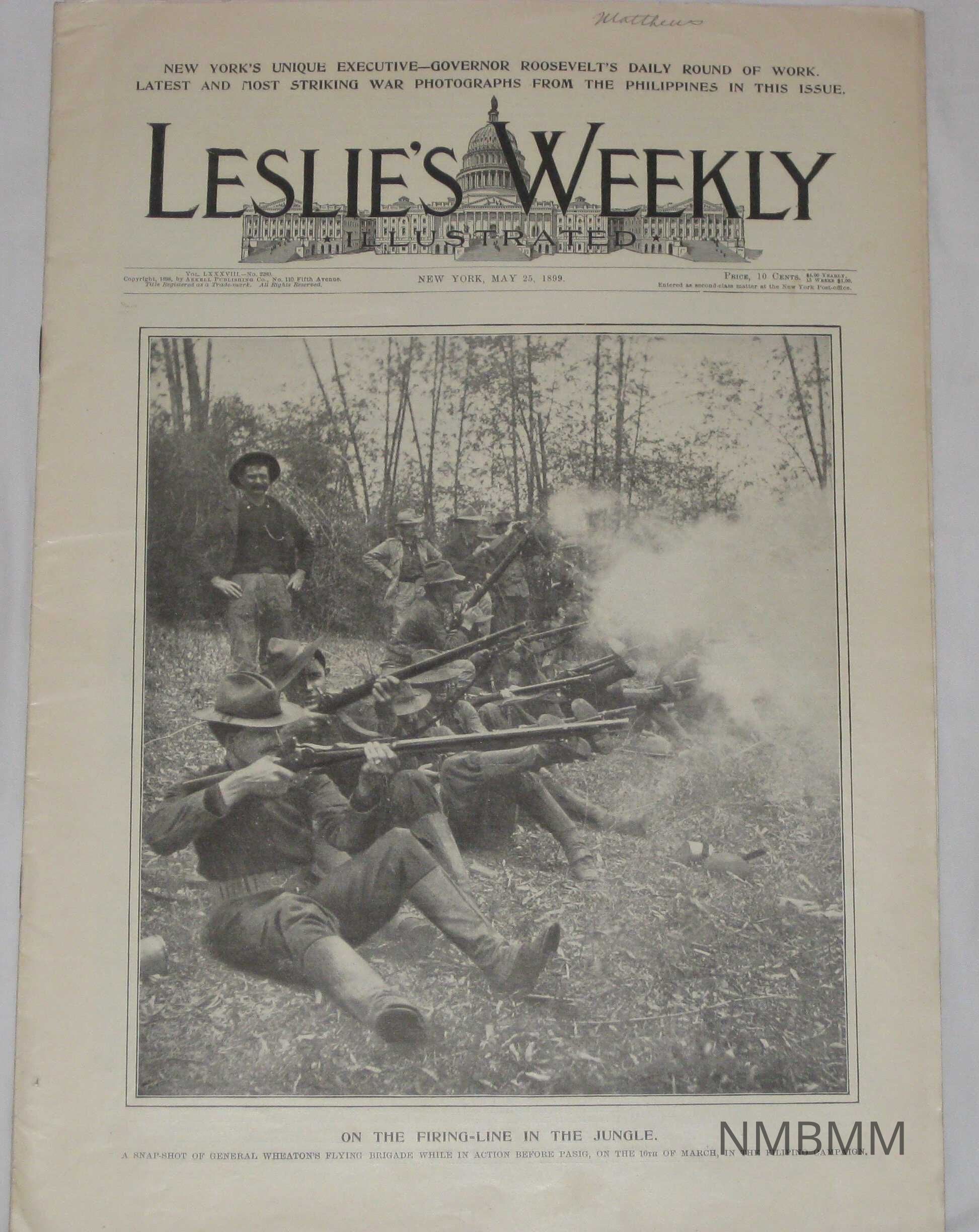 An issue of Leslie's Weekly Illustrated, Vol. LXXXVIII No. 2280. It was copyrighted by the Judge Company on 110 Fifth Avenue and published in New York on May 25, 1899. Printed at the top of the issue is "New York's Unique Executive -Governor Roosevelt's Daily Round of Work Latest and Most Striking War Photographs From the Philippines in This Isusse" On the front cover there is a line of soldiers firing with caption "On the Firing-Line in the Jungle, A snapshot of General Wheaton's Flying Brigade While in Action Before Pasig, on the 16th of March, in the Filipino Campaign"Collection