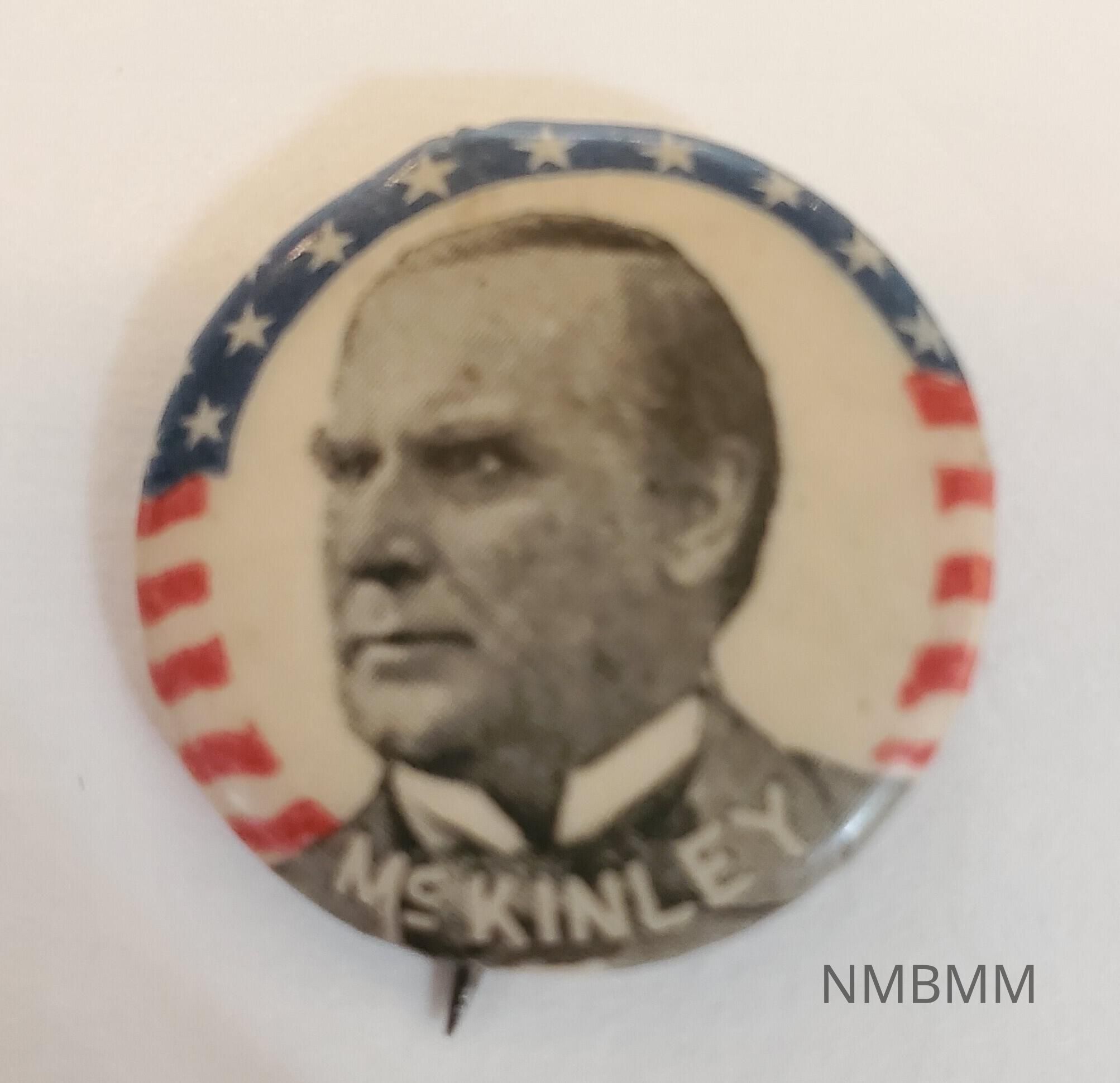 The item is a campaign pin containing a portrait of President McKinley, with an American flag background, and "McKinley" written underneathe his portrait. The back reads, "The Whitehead and Hoag Co., Newark, NJ, Patented July 17, 1894- April 14, 1896."Acquisition