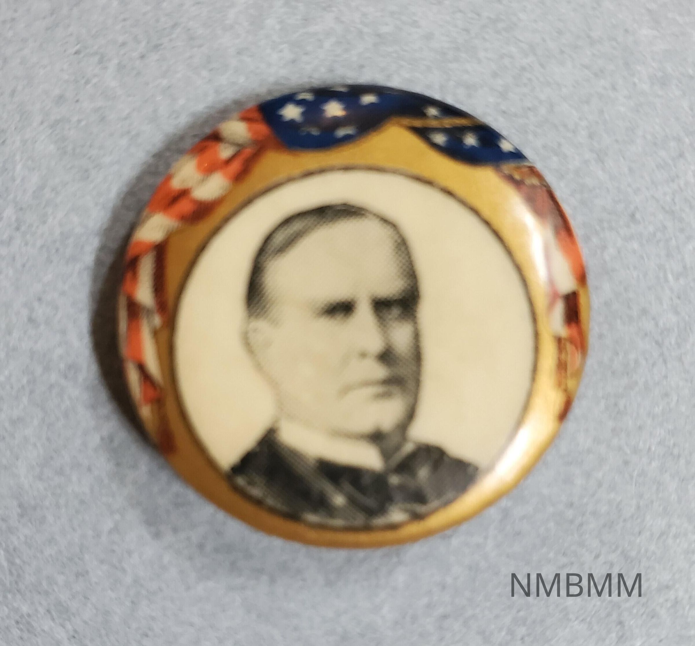Pin containing a portrait of President McKinley. The background is a white circle and gold trim with an American flag draped over the portrait.Acquisition
