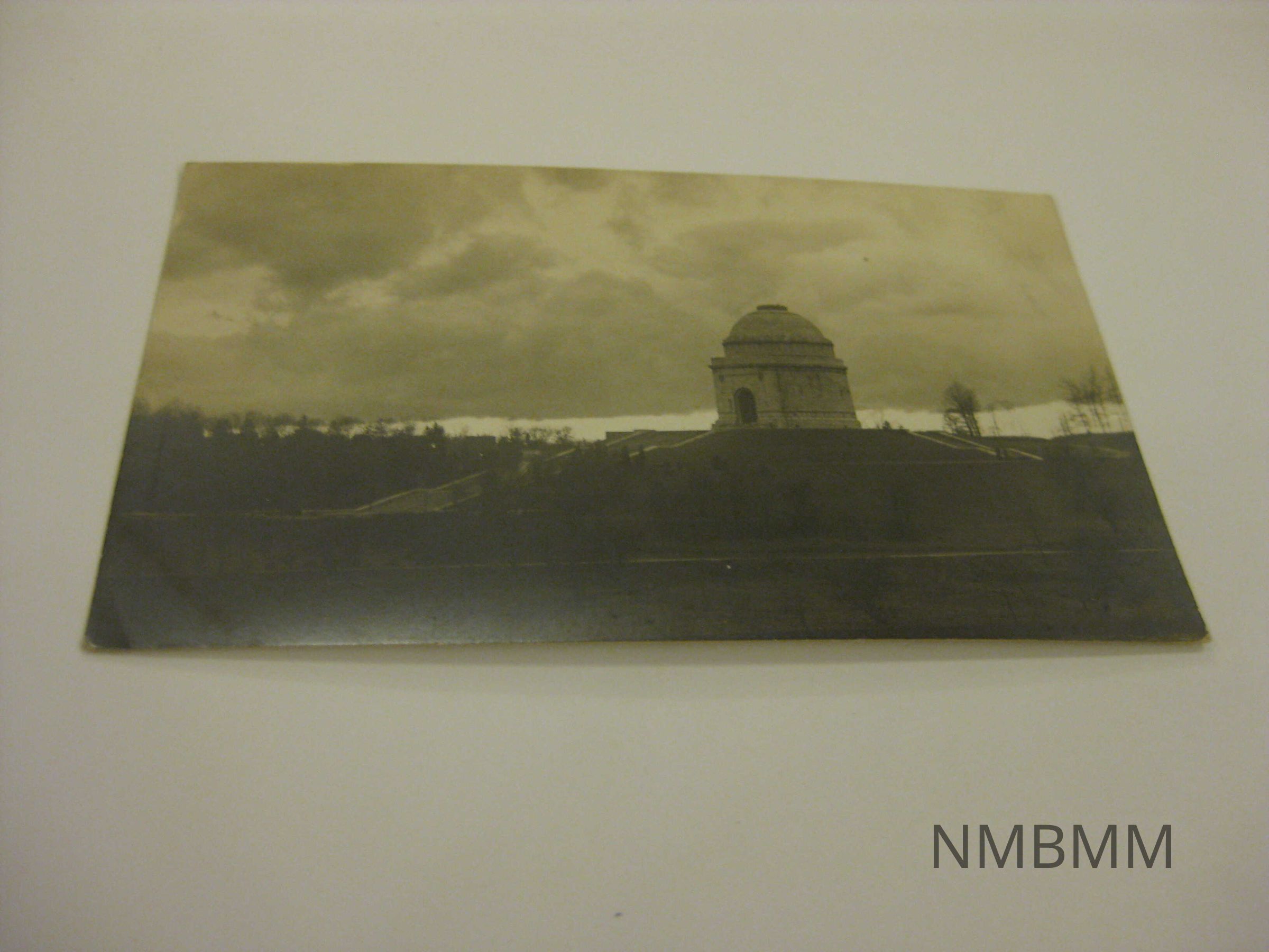 This item is a horizontal black and white postcard with an image of the McKinley Memorial in Canton, Ohio. There are a lot of clouds in the sky. Split Back side: 10-9-65 written in pen.Collection