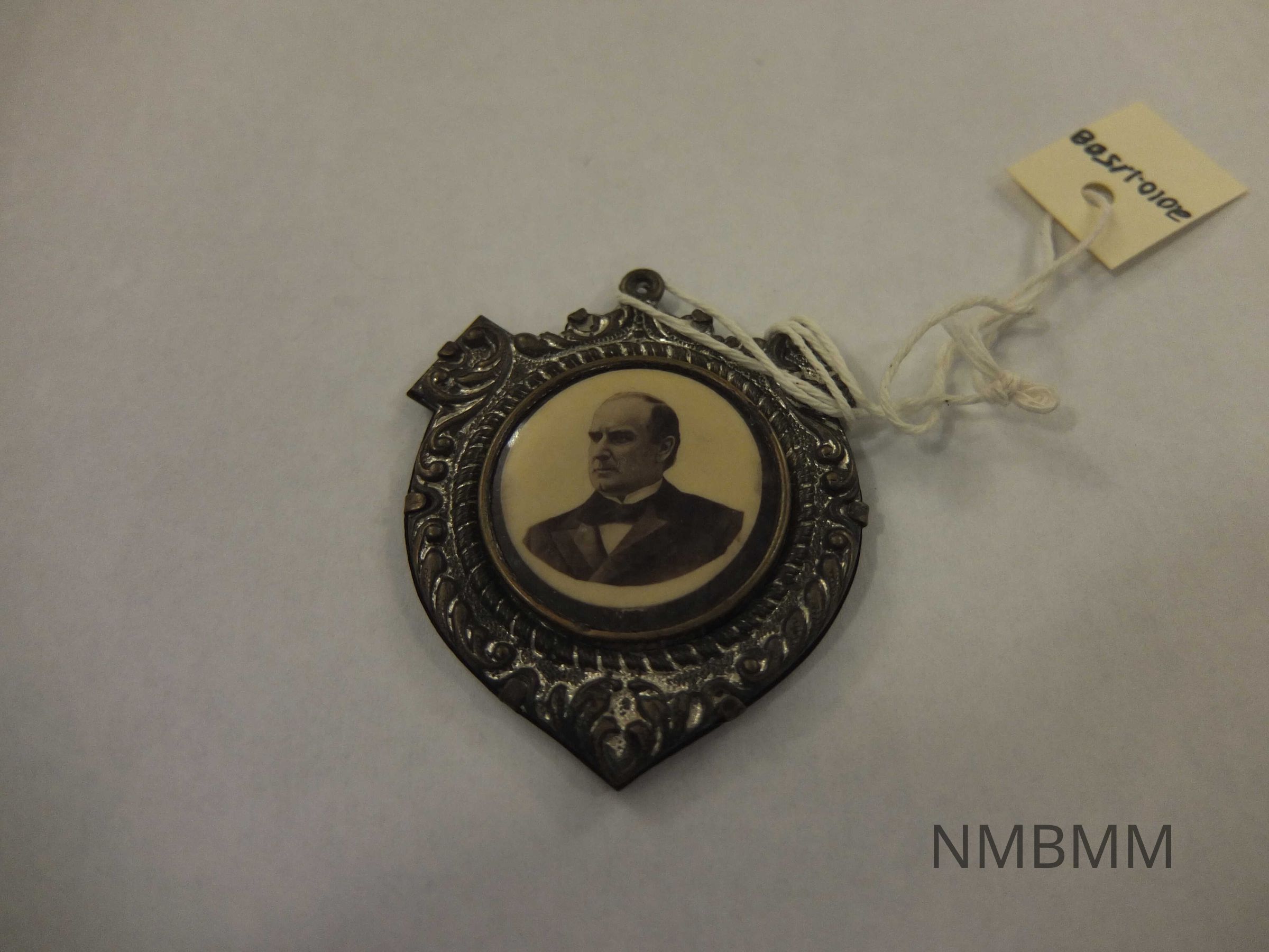 This item is a shield shaped pendant containing portrait of President McKinley on one side, and an insignia with the letters "F,C,B,KP". Above the insignia, is a helmet and two swords. One can barely make out the words "Cincinnati, Ohio" on the back.Collection