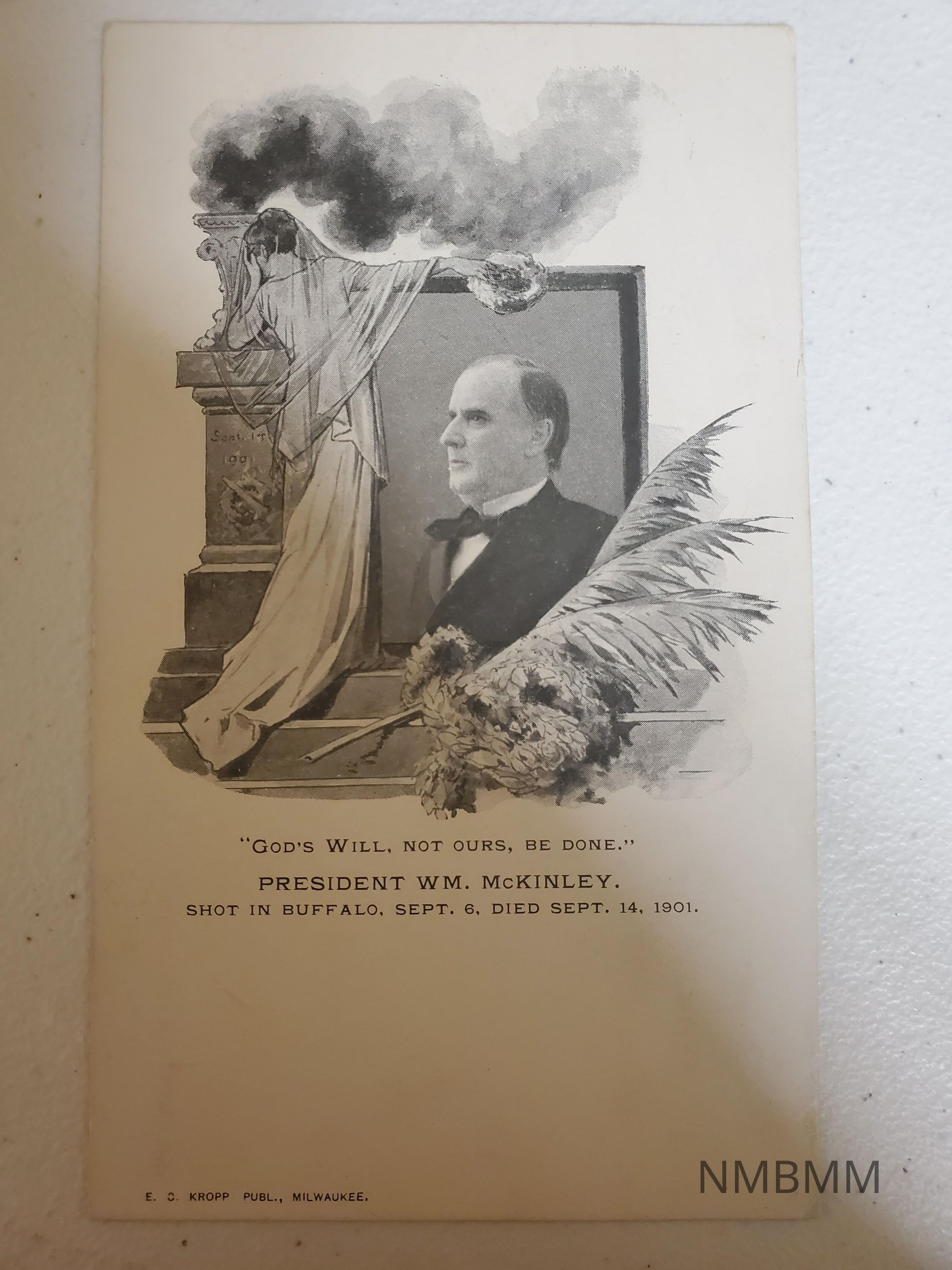 Postcard with a square black and white portrait of President McKinley featured with a monument spilling out smoke. The card features a woman with a veil crying and mourning the president. The text written on the front of the post card says, "'God's Will, Not Ours, Be Done.' President WM. McKinley. Shot in Buffalo, Sept. 6, Died Sept. 14, 1901."Collection