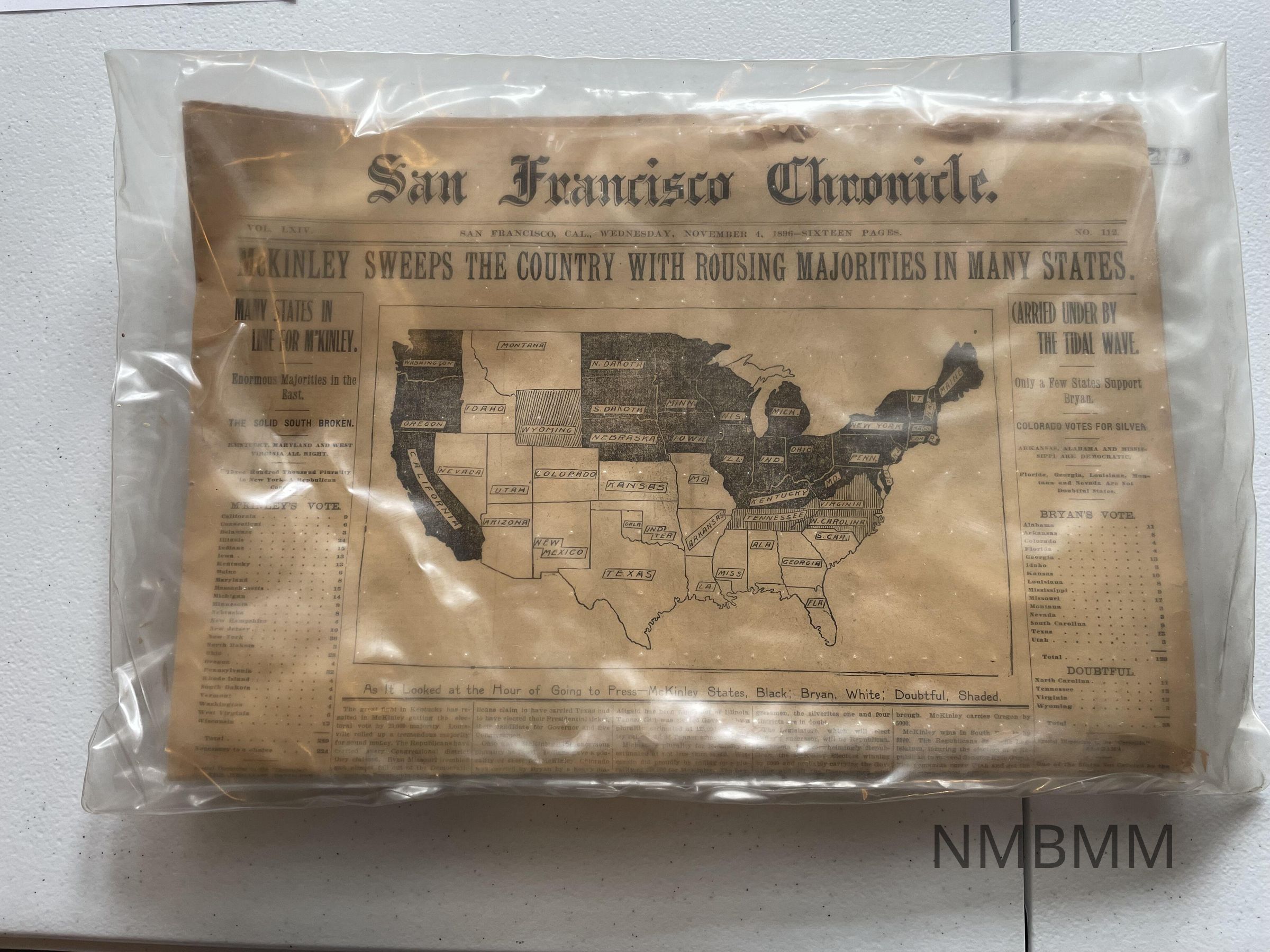 The item is a San Francisco Chronicle newspaper from Wednesday, November 4, 1896. It is 16 pages and features an authenticity certificate. The article is titled, "McKinley Sweeps the Country with Rousing Majorities in Many States."Acquisition