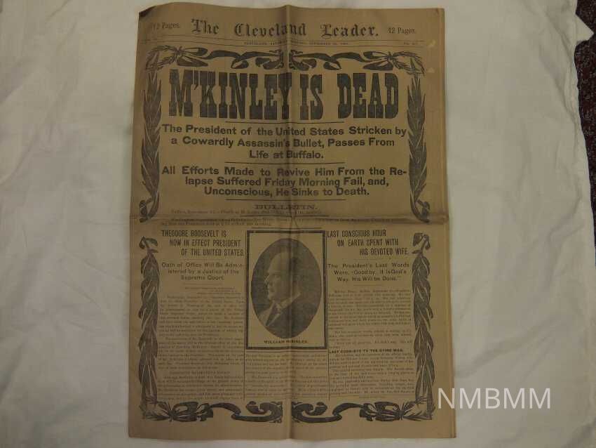 The item is a newspaper by The Cleveland Leader dated September 14, 1901 with the headline "M'Kinley is Dead" at the top and a portrait of President McKinley at the bottom.Collection