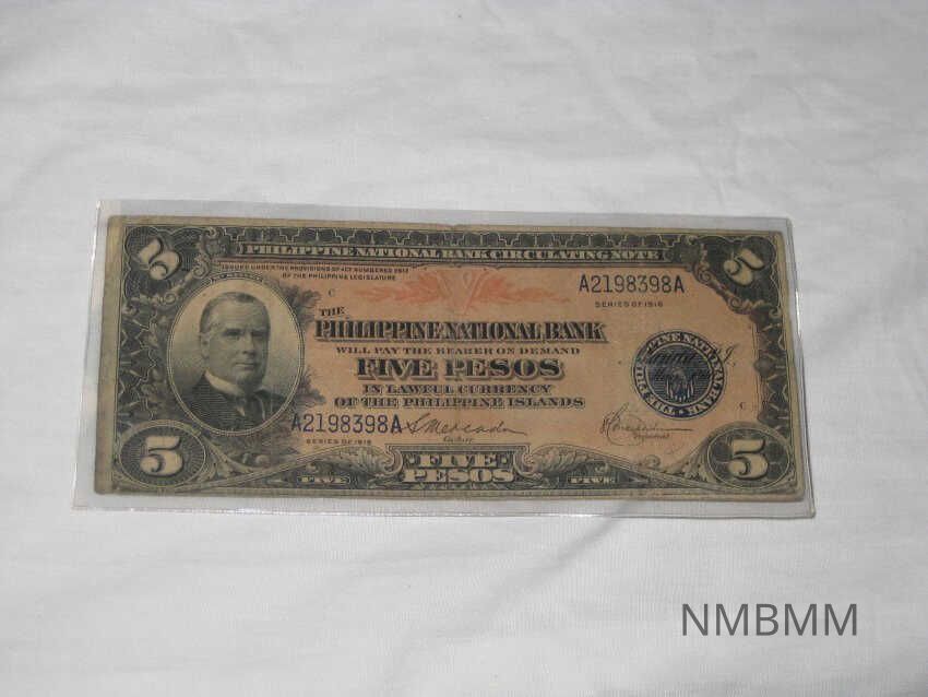 FIVE PESO NOTE ISSUED IN 1913 BY THE PHILIPPINES. RED WITH PICTURE OF MCKINLEY. IN PLASTIC IN BLACK BOX FRAME. 3" X 7"