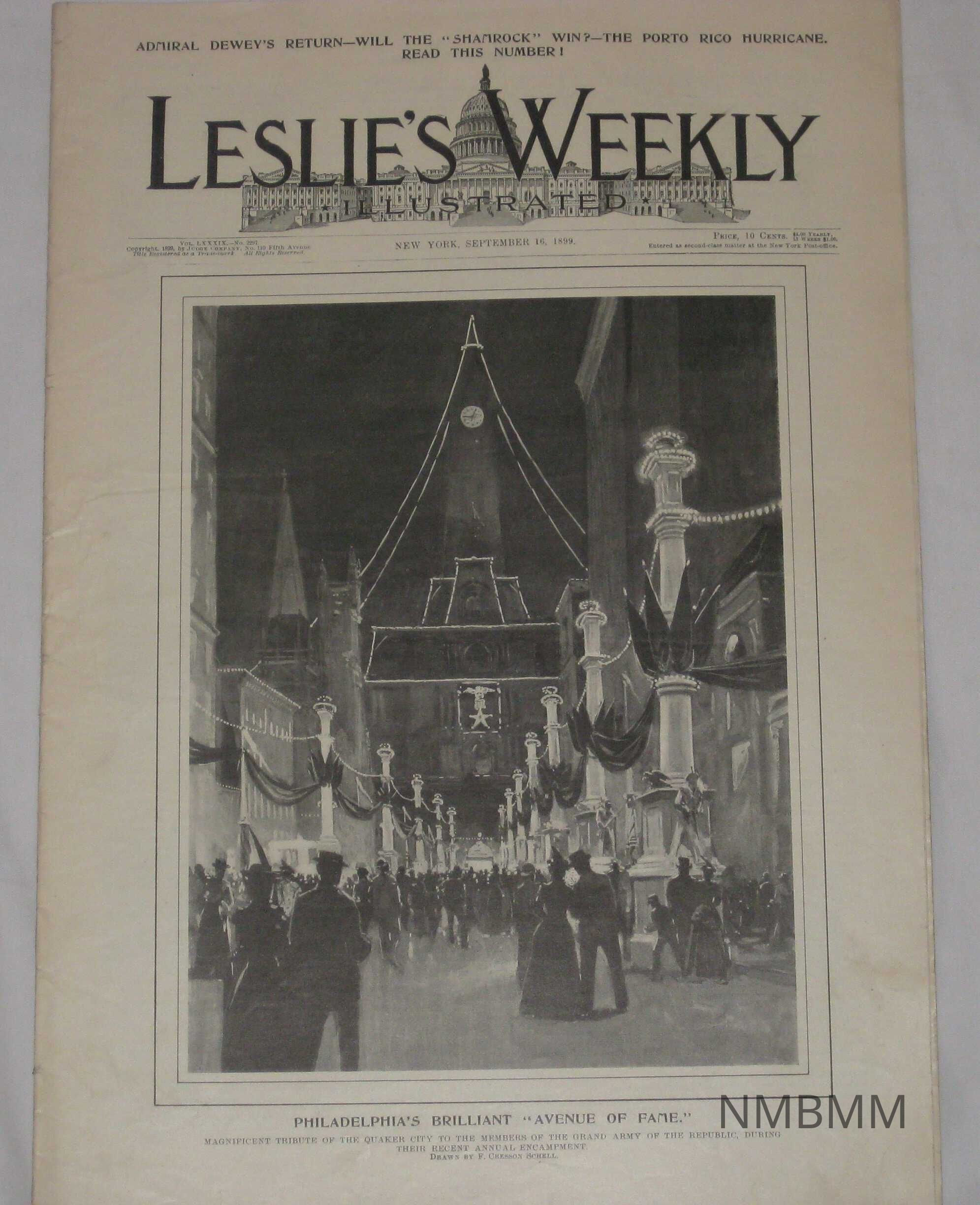 An issue of Leslie's Weekly Illustrated, Vol. LXXXIX No. 2297. It was copyrighted by the Judge Company on 110 Fifth Avenue and published in New York. Printed at the top of the issue is "Admiral Dewey's Return - Will the "Shamrock" Win?- The Porto Rico Hurricane, read this number!" On the front cover there is a picture of Philadelphia's Brilliant Avenue of fame, the caption reads Magnificent tribute of the Quaker city to the members of the grand army of the republic, during their recent annual encampment. The picture was drawn by F. Cresson Schell.Collection