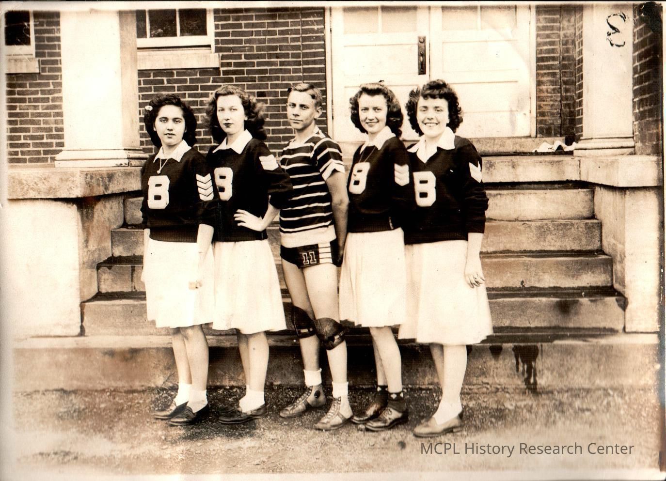 Five Burgin School cheerleaders. The are (left to right) Dolores Perkins, Edna Hager, John Edward Pat" Lear, Mary Cecil Jones Thompson, and Mary Helen VanarsdallCollection