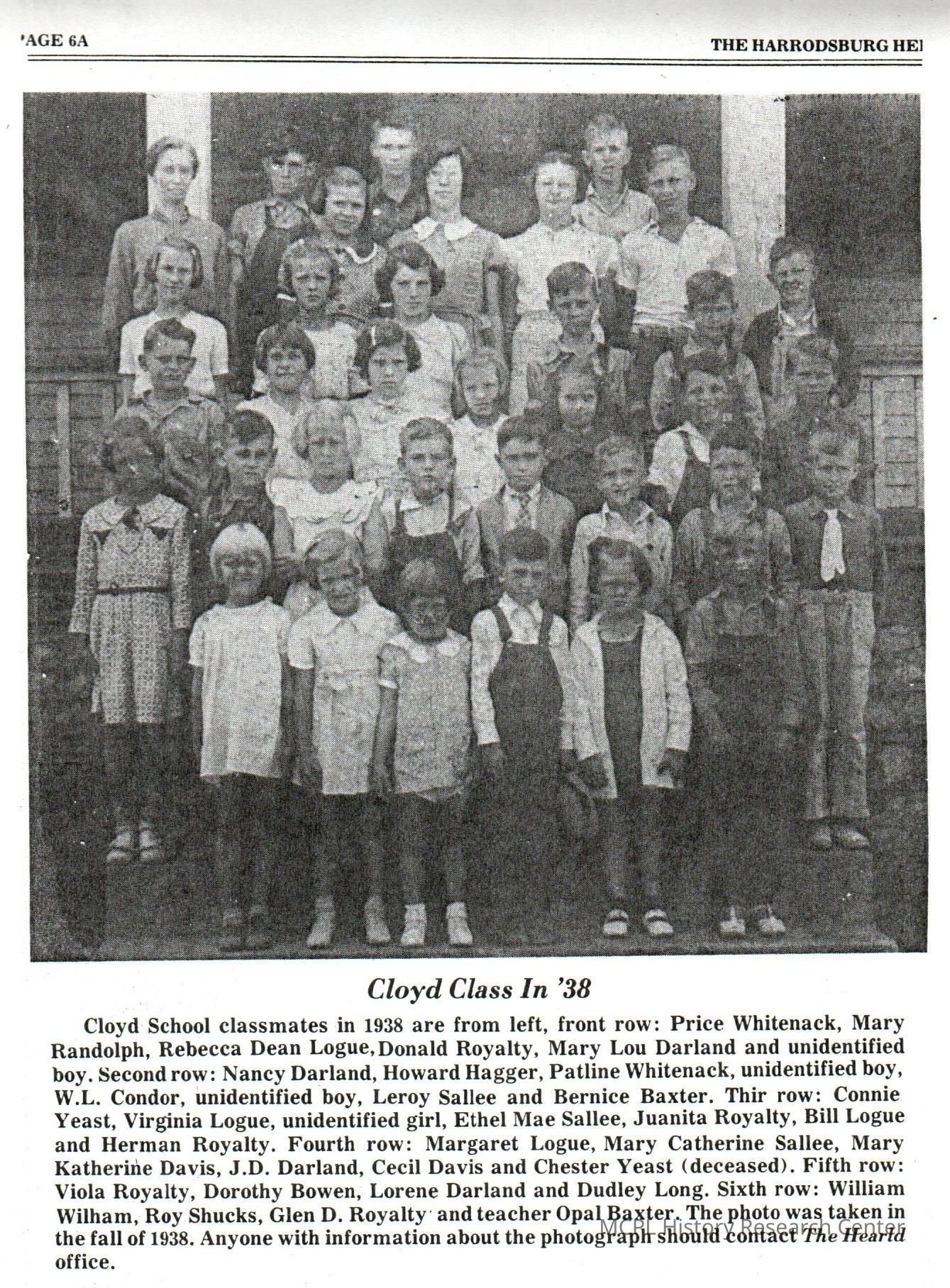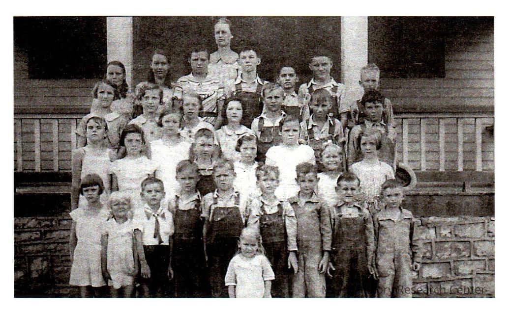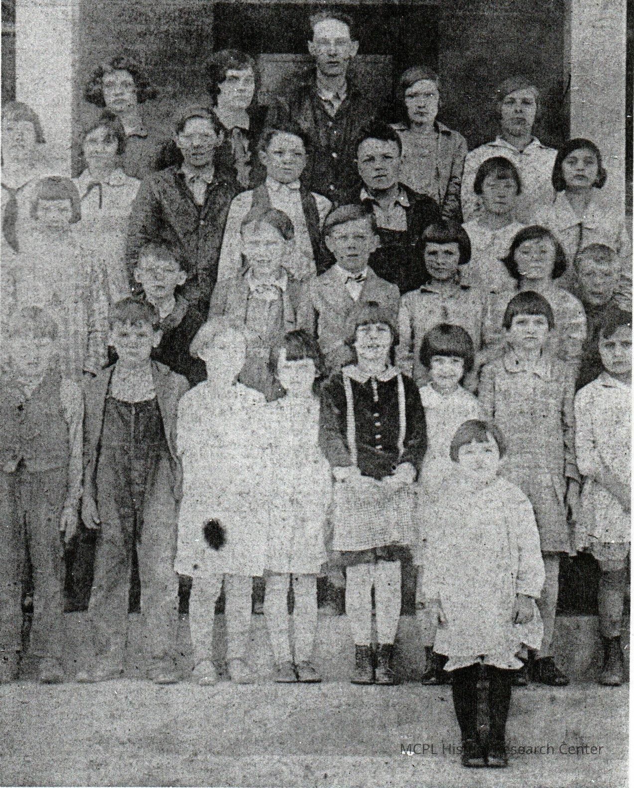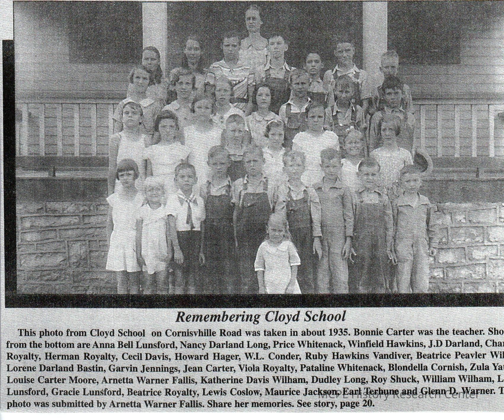 Cloyd School was located on Cornishville Road. This picture from 1929 features (l to r) on the back row: Mildred Cury, Rachel Whitenack (teacher), Lilburn Payne, Ruby Payne, and Genetta Smalley. The second row from back contains Elsie Devine, Nancy Cummings, Loman Long, Stanley Jackson, Hershall Wickersham, Lois Cummins, and Virginia Terhune. The third row has Mildred Long, Lewis Coslow, Dillard Payne, Leon Long, Virginia Long, Unknown Terhune, and Cecil VanDiver. The front row has John Cummings, Norris Curry, Nellie Owens, Mary Cummins, Leoda Long, Ava J. Long, Ida Mae Jackson, unknown Terhune, and (standing in front) is Lettie Jackson.Collection