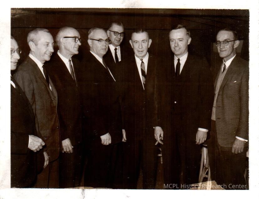 Corning executives participate in a local businessman's luncheon. Pictured (L to R) are John L. Ward, Farnham Shaw, W.H. Phillips, Paul T. Clark, J.H. Allen, James I. Peter, Amory Houghton Jr., and Joe Murphy.Collection