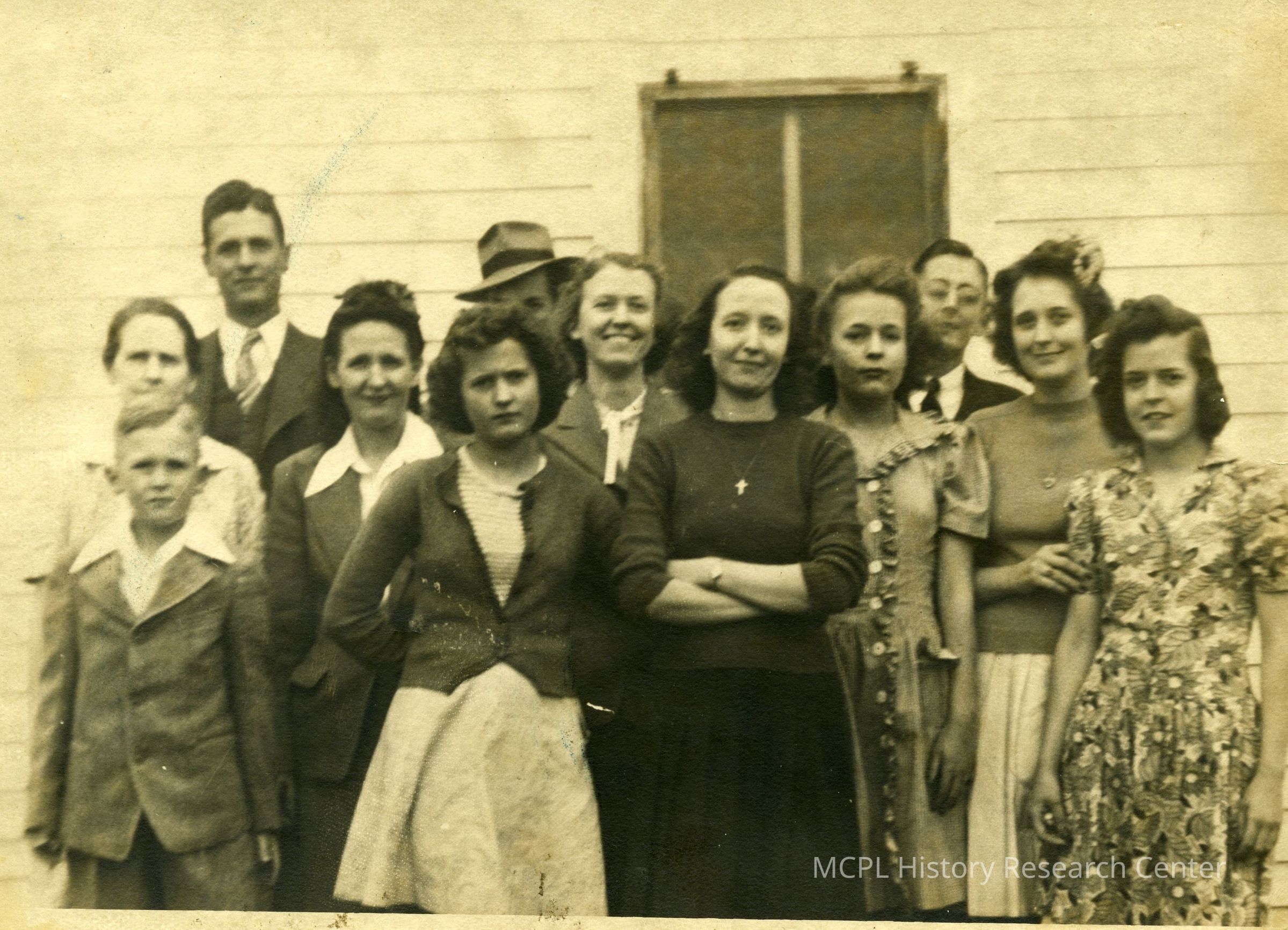 Pictured on the front road (l to r) are Owen Lee, Mary Ann, Irene, and Joy Christine. In the middle row are Cornelia, Edna, Georgia, Lois, and Vivian. The three men in the back are Maurice, Bruce, and Paul.Created By