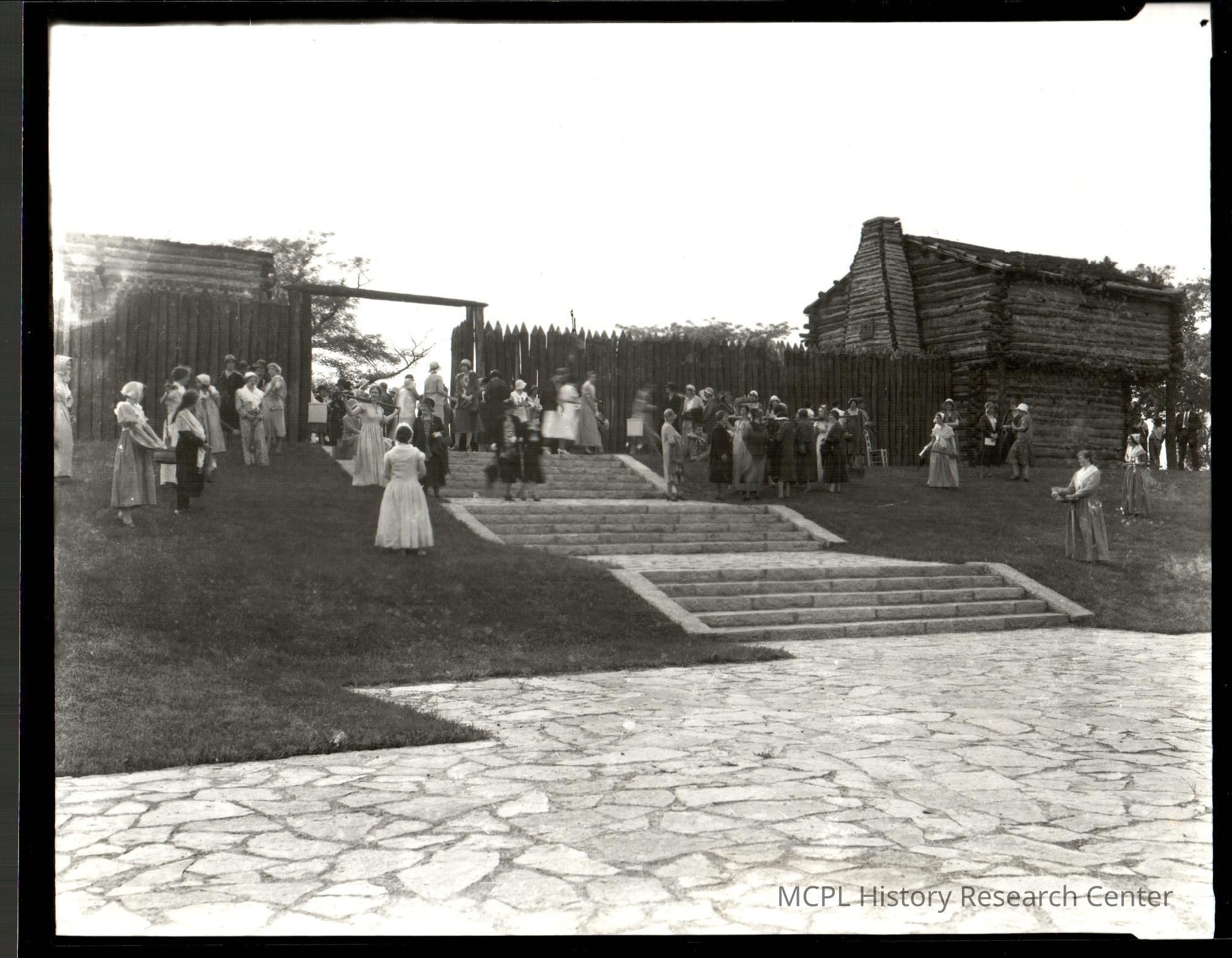 The 1932 Founder's Day celebration showing a number of guests look on as several reenactors carry water bucketsCollection