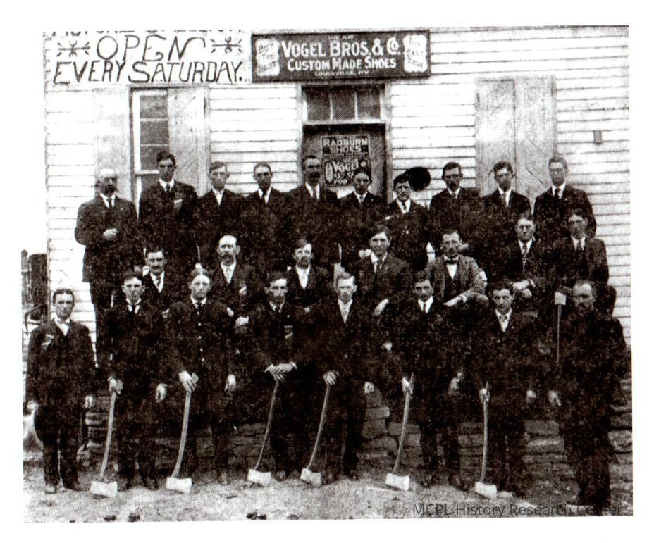This photo of the Modern Woodmen Lodge at Duncan, Kentucky. The meetings were held on the second floor of the store. Pictured (L to R) Front Row: Rome Hendren, Arlie Sims, Lloyd Sims, Creed Rose, Wafe Graham, Elmer Brown, Harvey Rose, and Bill Voorhies.