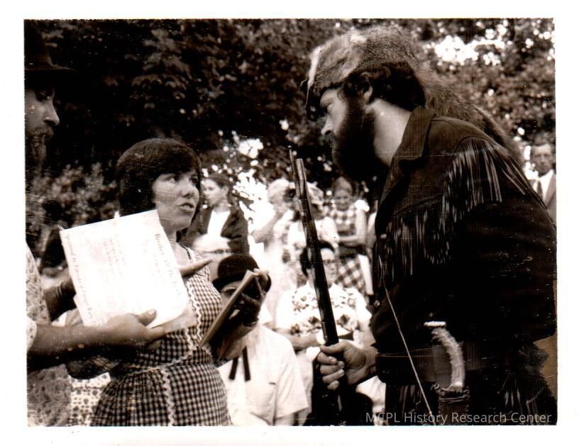This photo provides no context other than it was taken during the bicentennial celebration. The visible certificate for the Brothers of the Brush and the notebook in Ms. McKinney's hand suggests she is a judge in the beard contest.Collection