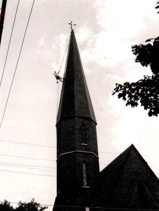 Clarence Vinyard paints the steeple of St. Phillips Episcopal ChurchCollection