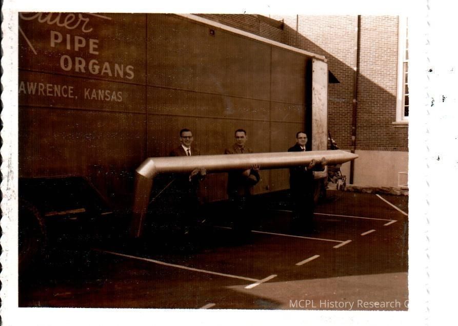The largest of the 2,171 pipes in the Pipe Organ at Harrodsburg Baptist Church is held by Rev. Wallace Carrier, Hugh E. Reed (choir member), and William F. Warder (minister of music),Collection