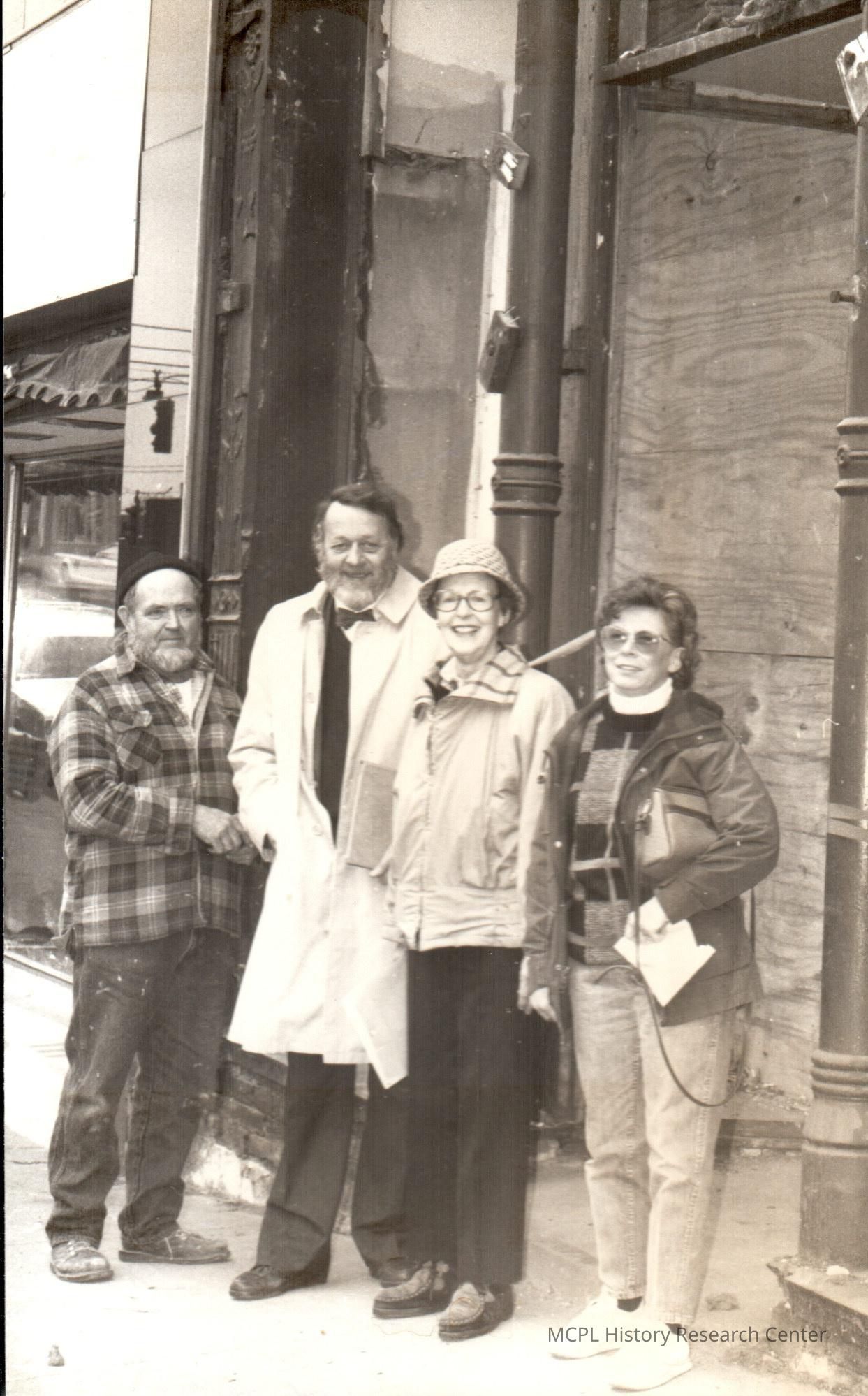 This photo features four individuals working on the project. The second person from the left is the architect. To his right is Mary Jones. The man and woman on either end are unidentified.Collection