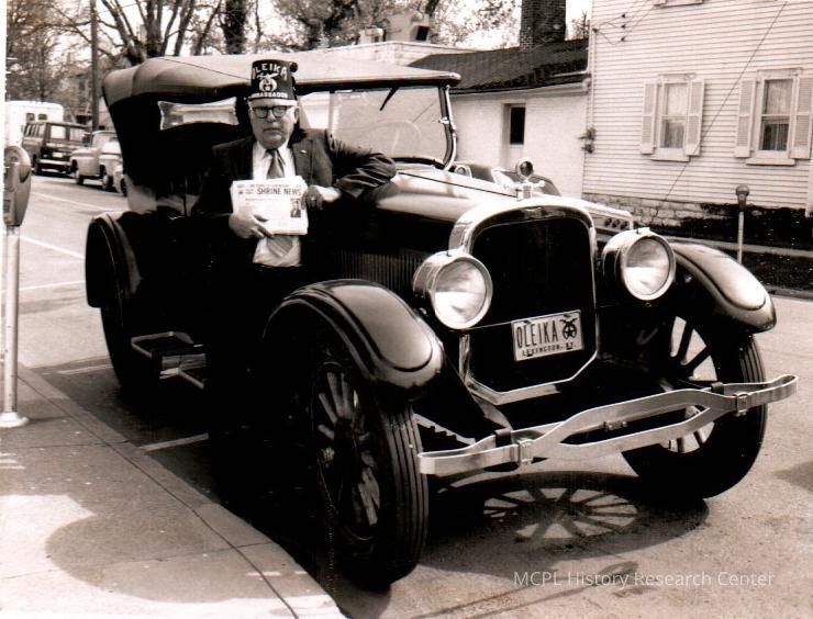 Shriner Frank Cornish stnading next to a 1922 model Chandler sport touring car.Collection