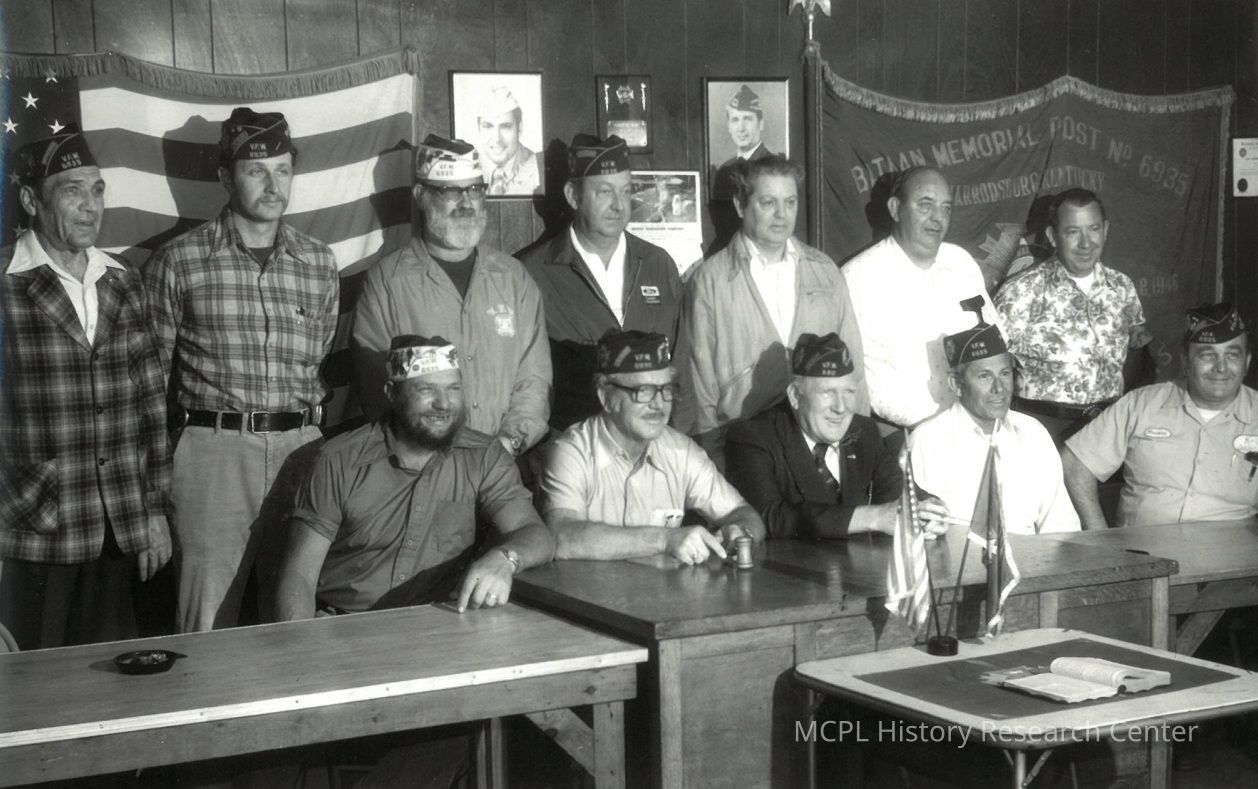 Bataan Memorial Post 6935 officers being sworn in. Pictured (l to r) in the back row are ZB Teater, Buddy Howells, Roy Freeman, Lawrence Lay Jr, James Tewmey, Dale Vories, and Robbie Stevens. In the front row is Cohen Teater, Kenneth Parker (new commander), Joe Beitz (past state commander), JB Stevens, Howard Howells Sr.Collection