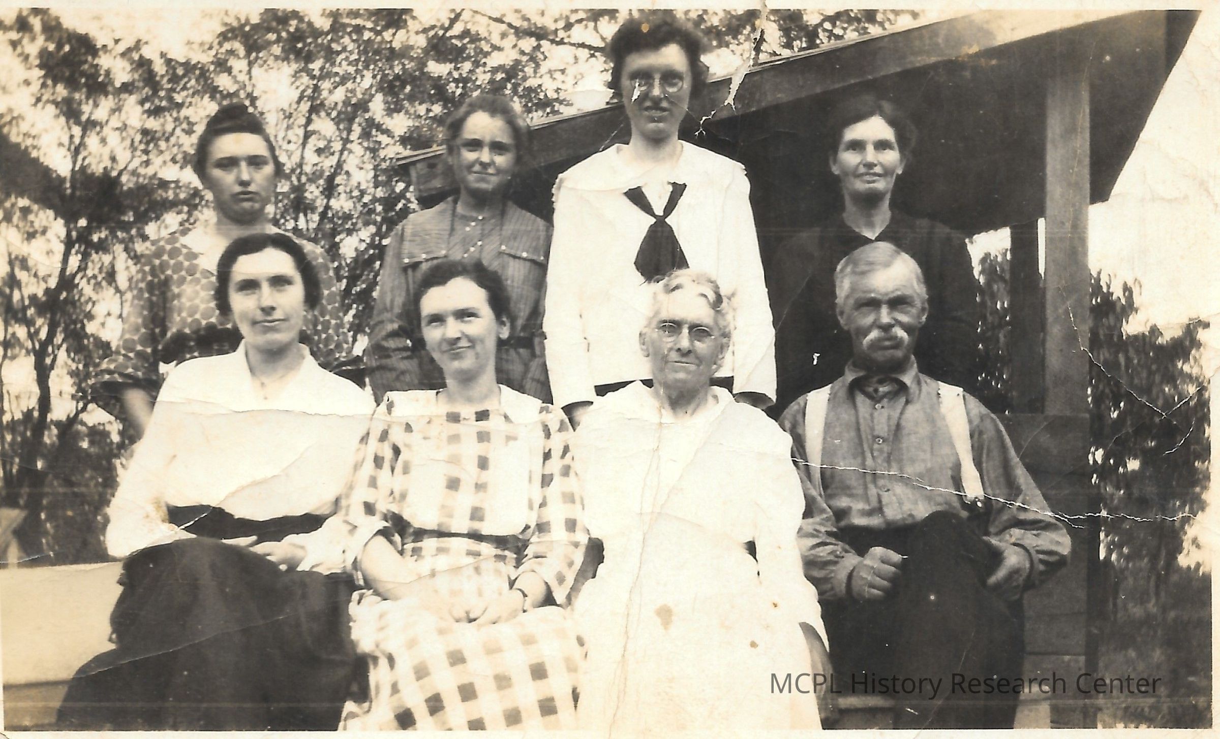 Pictured in the back row (l to r) are Ruth Demaree, Treva Yates, Vera Hawkins, and Willia Royalty. In the front row are Mae Shirley, Ottie Hurst, Sallie Taylor Woods, and Jim Woods.Created By