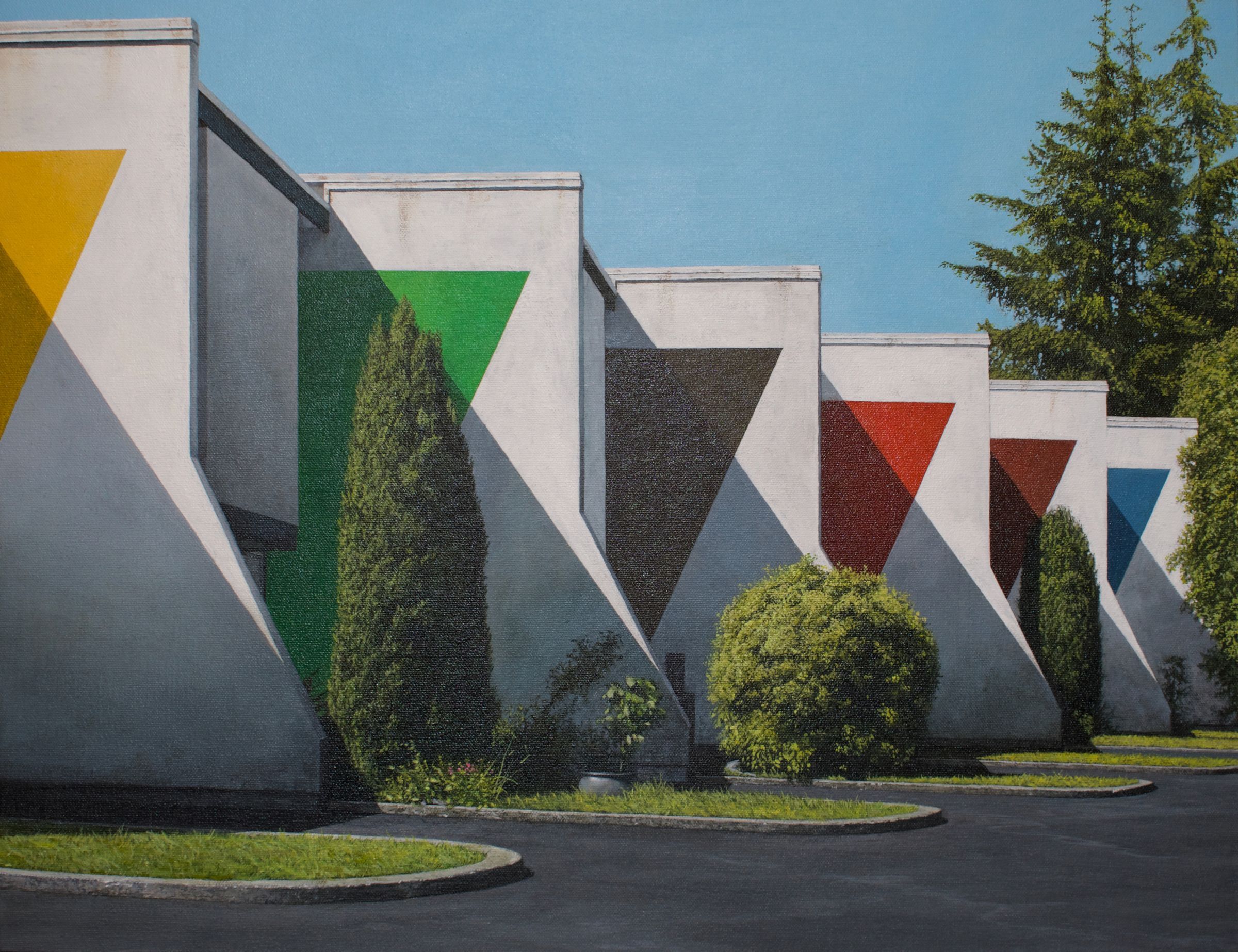 McSavaney observes his architectural subjects with the precision of a camera lens as he mimics the principles of photography in the medium of paint and ink. The angles, lighting, and mechanics of the architecture are studied, simplified and broken down into lines and intersecting planes in order to recreate it on the canvas. That said, the artist diverges from reality leaving his own mark on the painted version of the buildings. The flat white concrete walls of painted structures are ornamented with boldly coloured geometric patterns and lines. They are given a layer of depth as McSavaney repurposes and reshapes them into art.